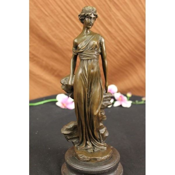 A young maiden steals a leisurely moment in the day to relax. She leans against a rock and gazes into the distance. She wears a long goddess-like dress that slouches off her shoulder and drapes over her slim body. This sculpture was cast using the lost wax method and mounted on a marble base. Bronze dimensions with marble base: Height 14 X Width 5 inches. Weight: 10 lbs.Please Note: This is a reproduction bronze sculpture from the original molded and signed. This featured bronze sculpture is a recast after the original, and has been done recently. This 100% bronze sculpture is an abstract piece certain to be a conversation piece.Please Note: This is a reproduction bronze sculpture from the original molded and signed. This featured bronze sculpture is a recast after the original, and has been done recently. This 100% bronze sculpture is an abstract piece certain to be a conversation piece.