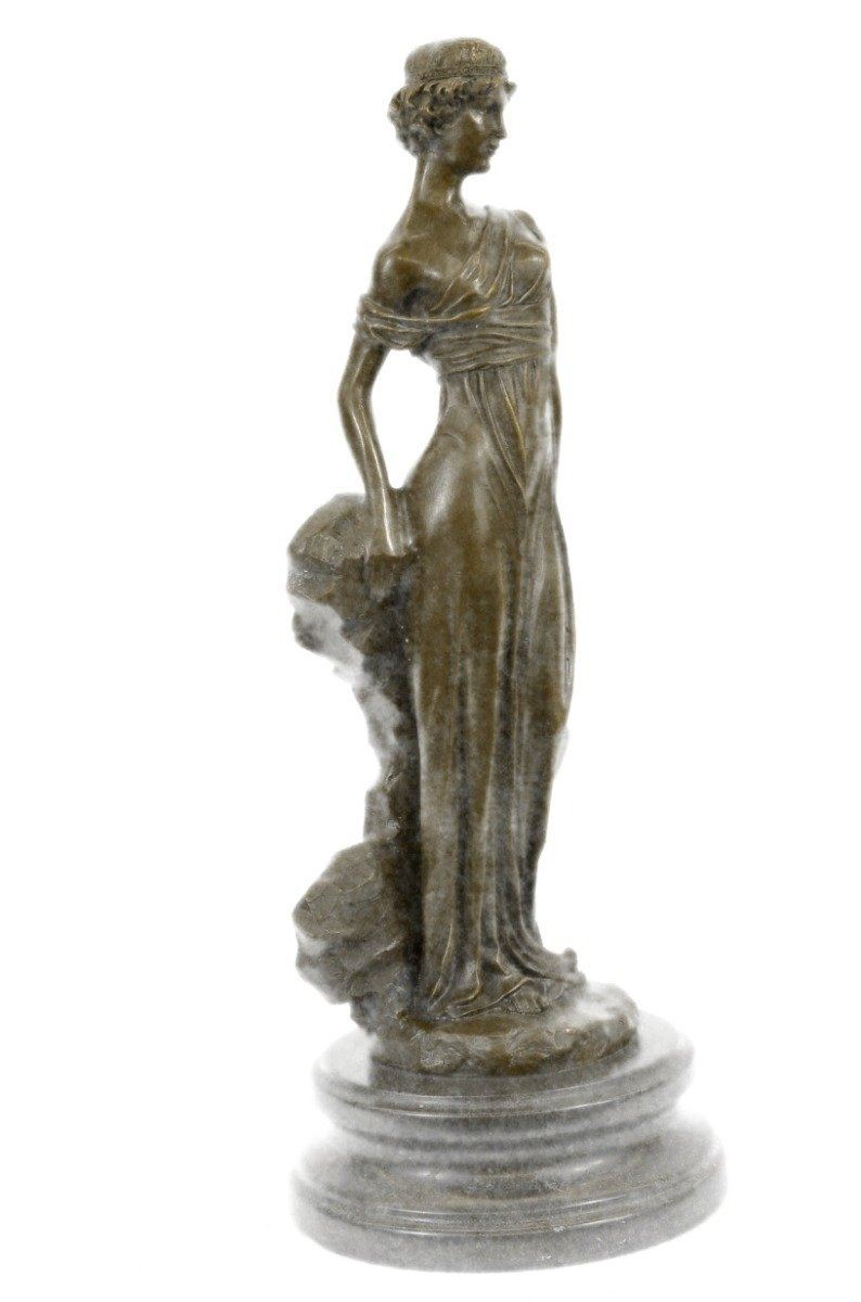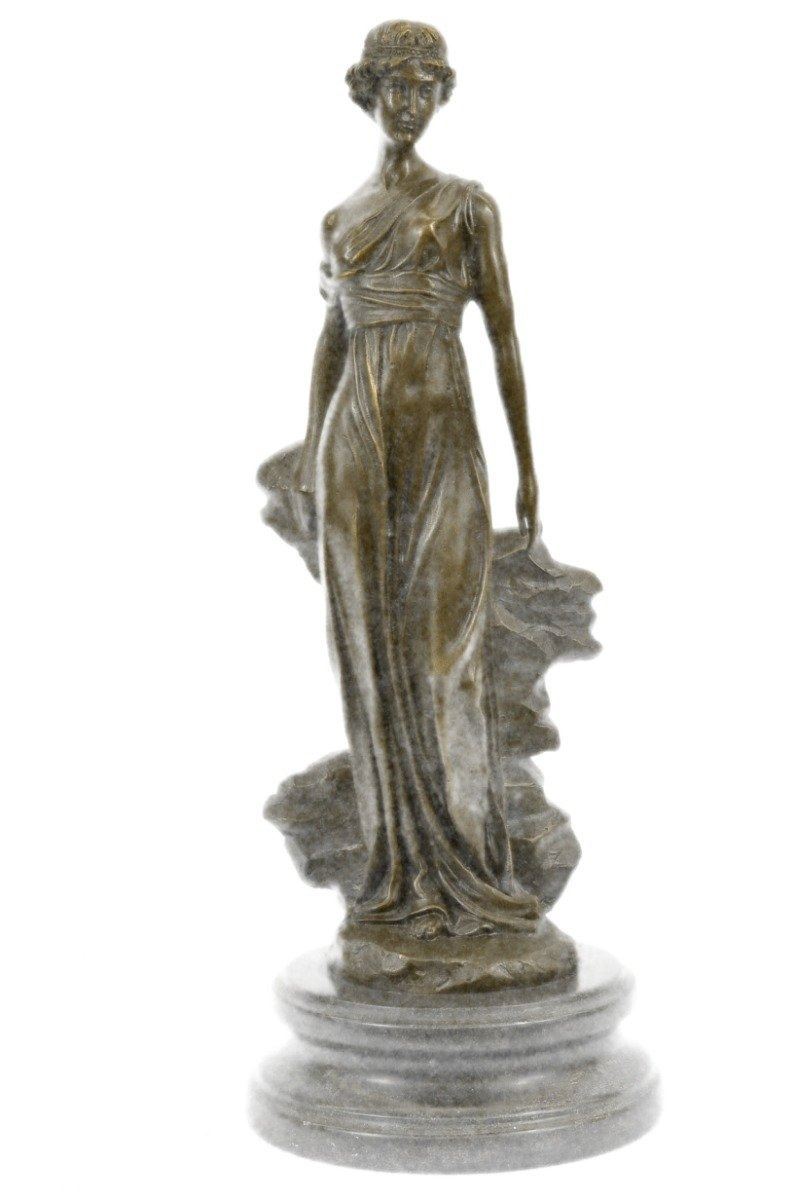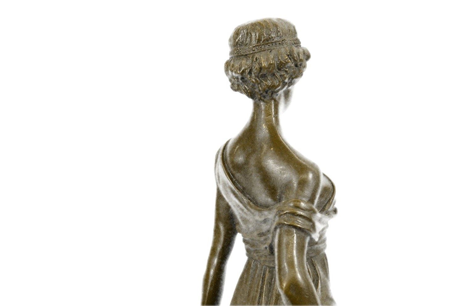 A young maiden steals a leisurely moment in the day to relax. She leans against a rock and gazes into the distance. She wears a long goddess-like dress that slouches off her shoulder and drapes over her slim body. 100% bronze and handmade, this sculpture was cast using the Lost Wax Method and mounted on a marble base. Bronze Dimensions with Marble Base: Height 14 X Width 5 inches. Weight: 10 LBS. Inventory: 15-B6954651
