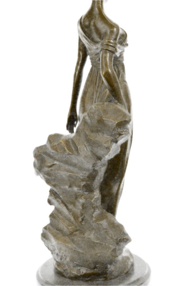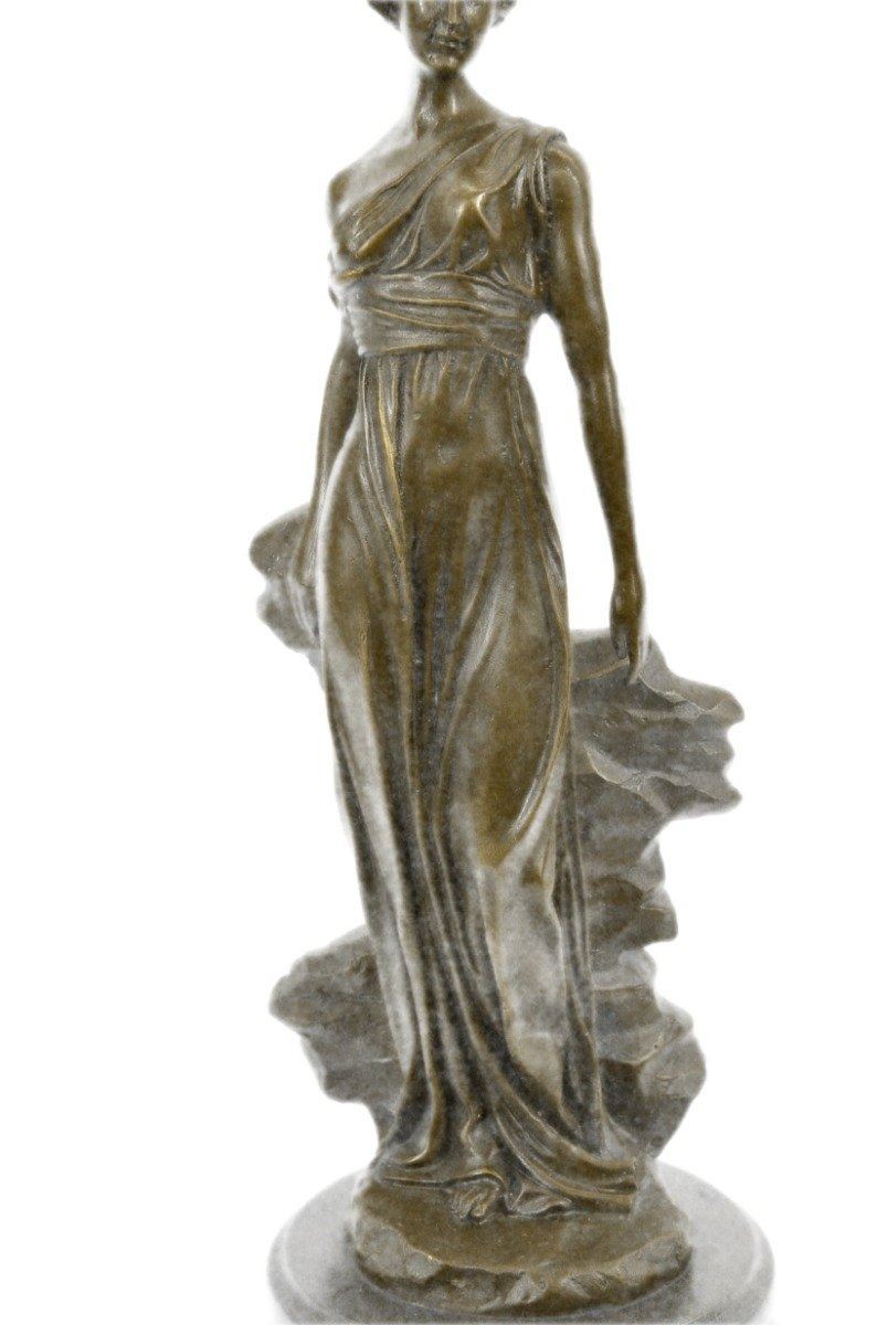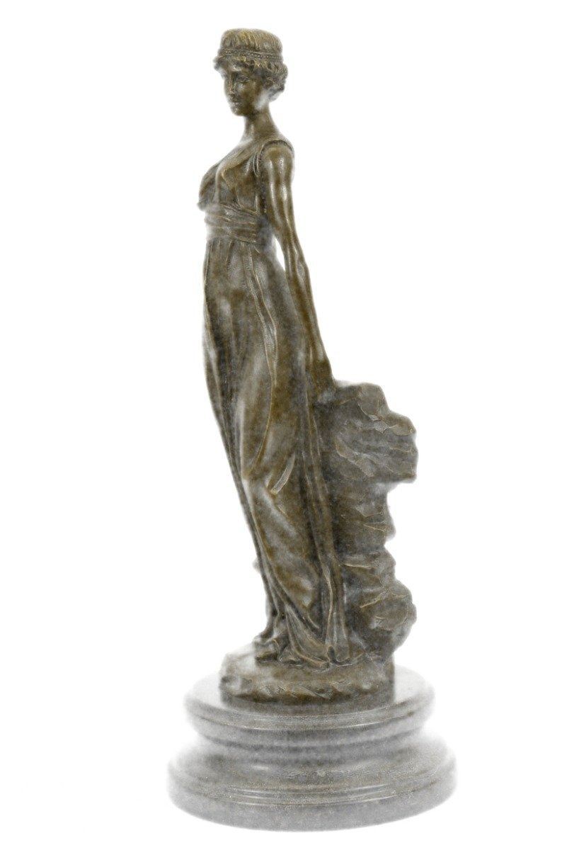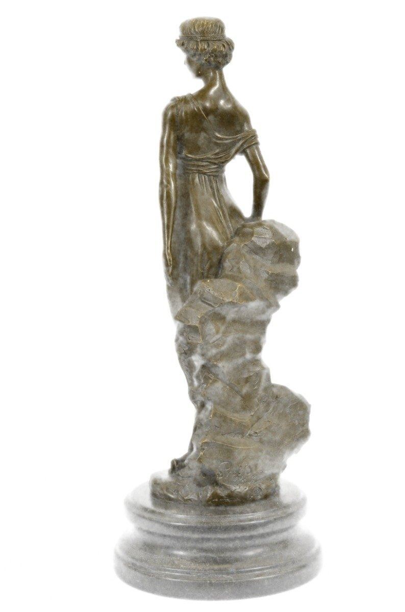 A young maiden steals a leisurely moment in the day to relax. She leans against a rock and gazes into the distance. She wears a long goddess-like dress that slouches off her shoulder and drapes over her slim body. 100% bronze and handmade, this sculpture was cast using the Lost Wax Method and mounted on a marble base. Bronze Dimensions with Marble Base: Height 14 X Width 5 inches. Weight: 10 LBS. Inventory: 15-B6954651