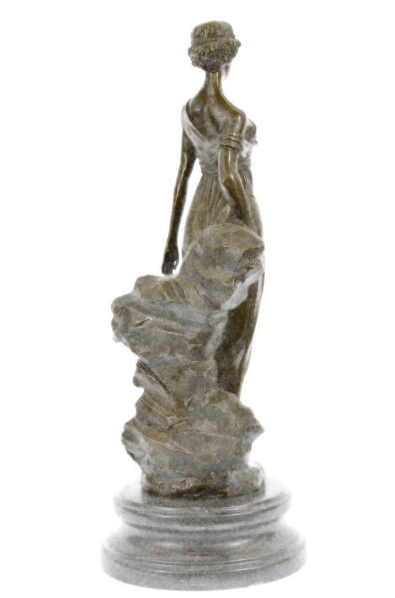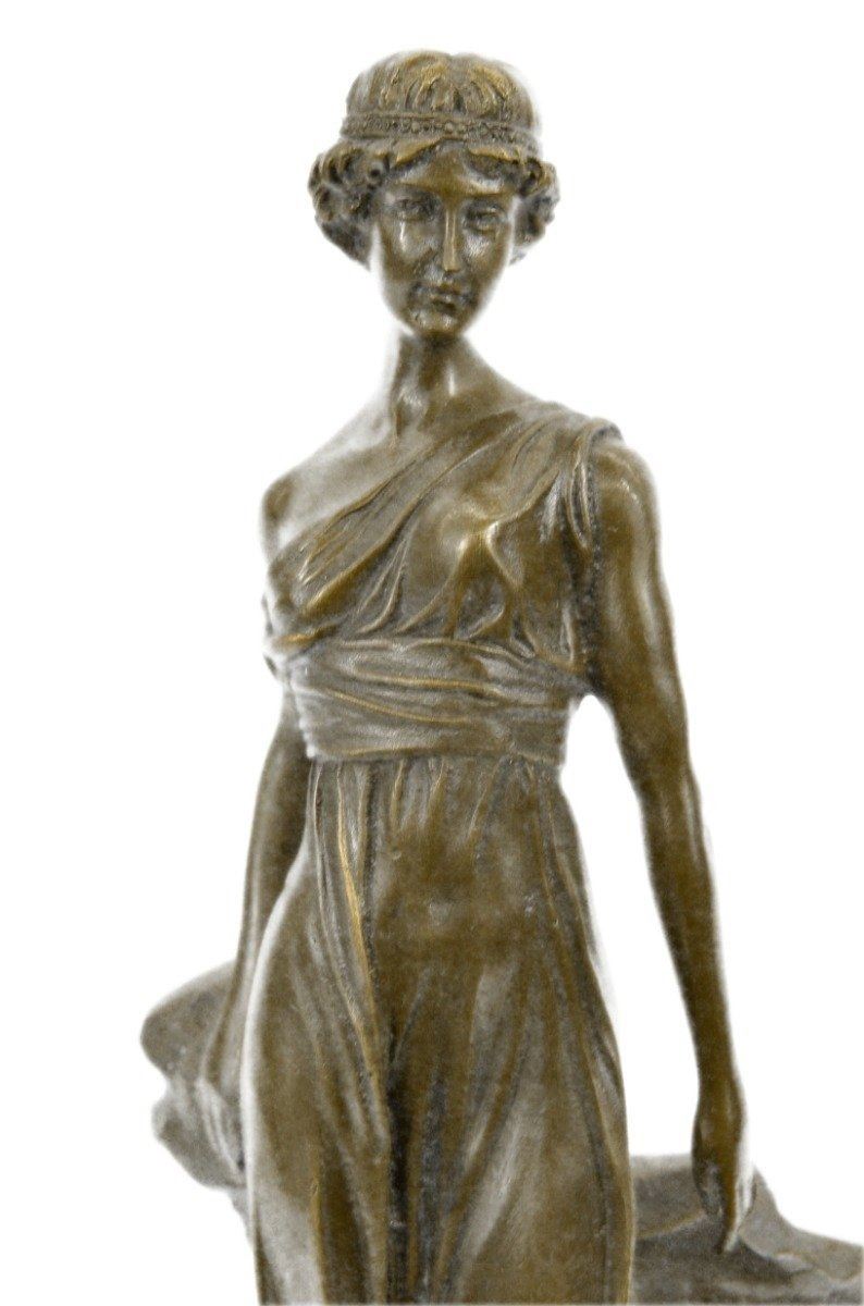 A young maiden steals a leisurely moment in the day to relax. She leans against a rock and gazes into the distance. She wears a long goddesslike dress that slouches off her shoulder and drapes over her slim body. 100% bronze and handmade, this sculpture was cast using the Lost Wax Method and mounted on a marble base. Bronze Dimensions with Marble Base: Height 14 X Width 5 inches. Weight: 10 LBS. Inventory: 15B6954651