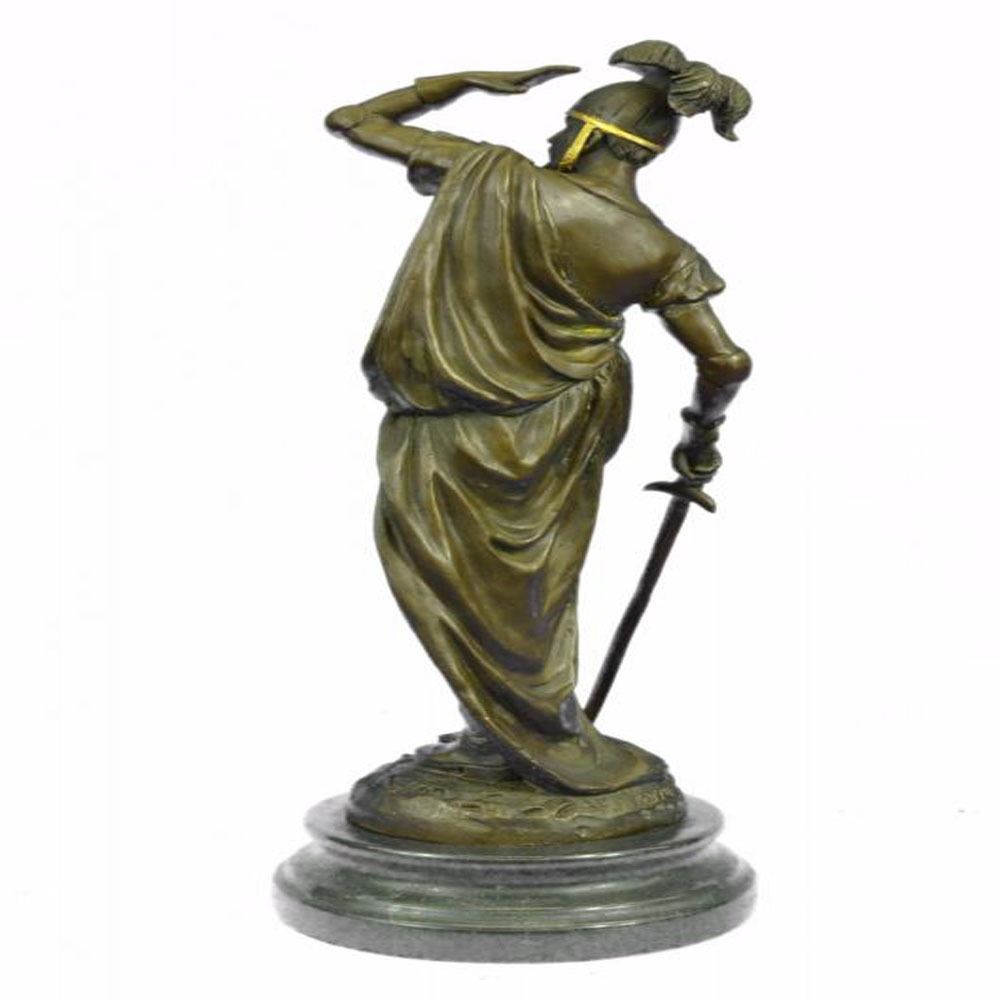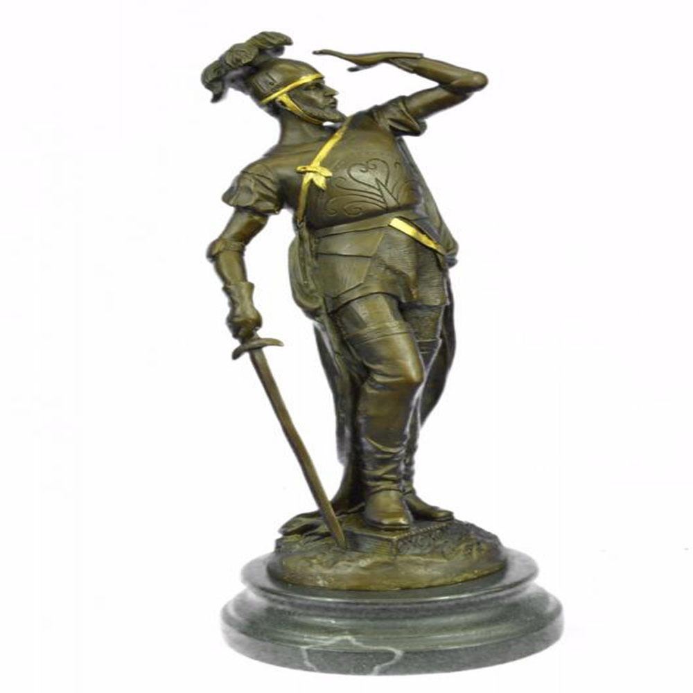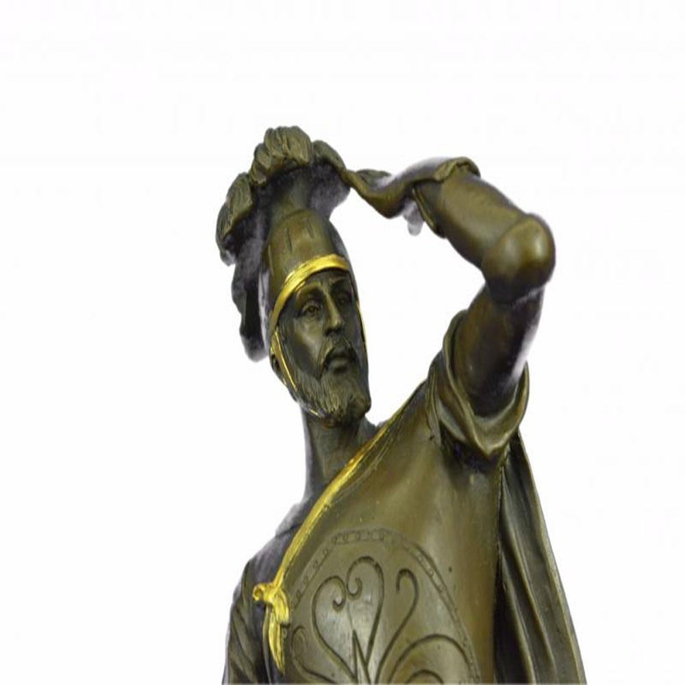 The Roman legion soldier stands looking to the horizon of a scarred battlefield. He is wearing some of the soldiers regalia. Atop of his head he wears a galea, which is a soldiers hat. Down his back falls a paludamentum, which is a long cloak fastened over one shoulder, usually signifying the commanders status. Around his waist he wears a tunic which is customary for soldiers to have it a little above the knee. In his right hand he carries a sword used in offense. The Bronze handmade Sculpture was cast using the ancient method of lost wax casting and stained with a brown and gold patina finish for preservation. It is mounted upon a marble base. Bronze Dimensions with Marble Base: Height 15 X Width 7 inches. Weight: 11 LBS.