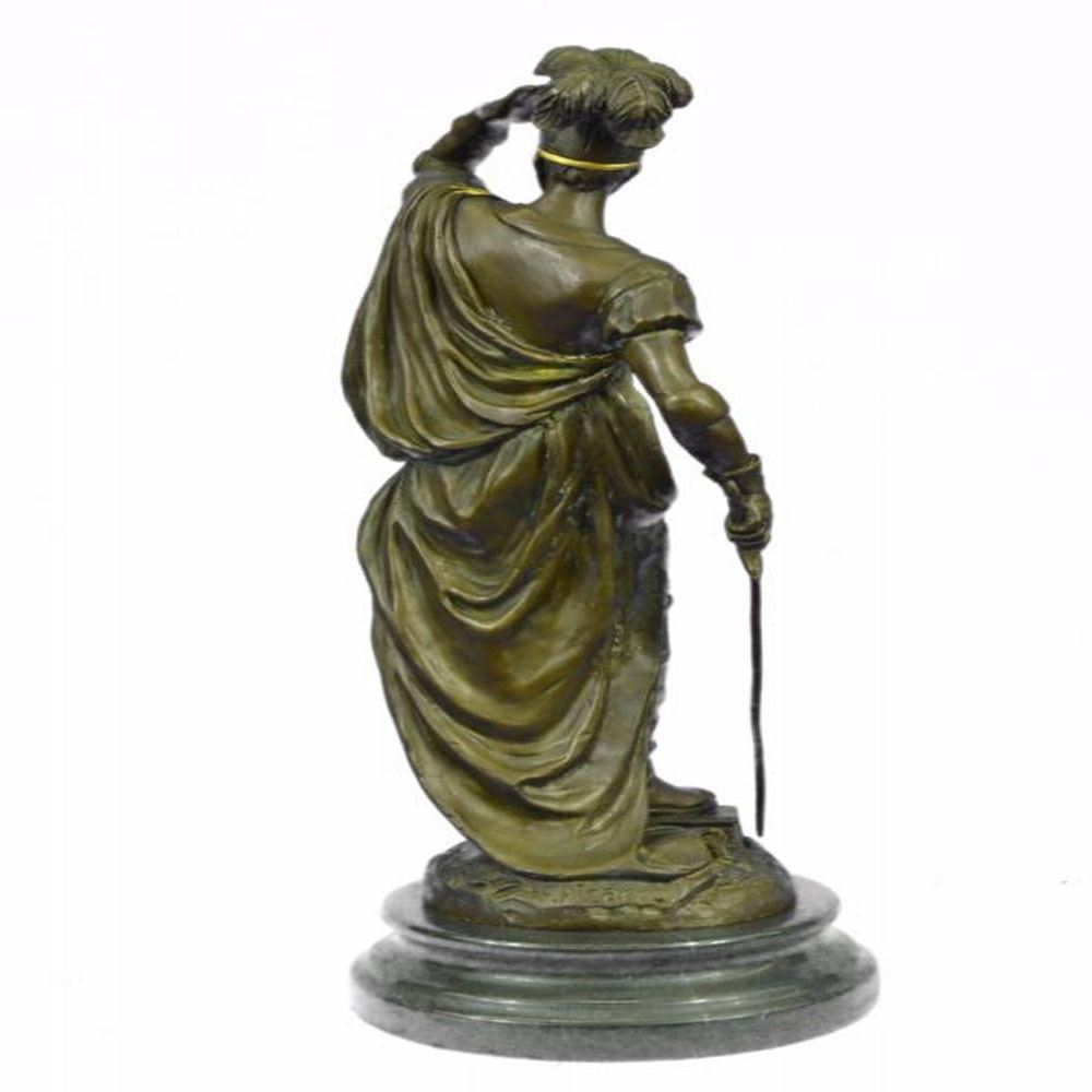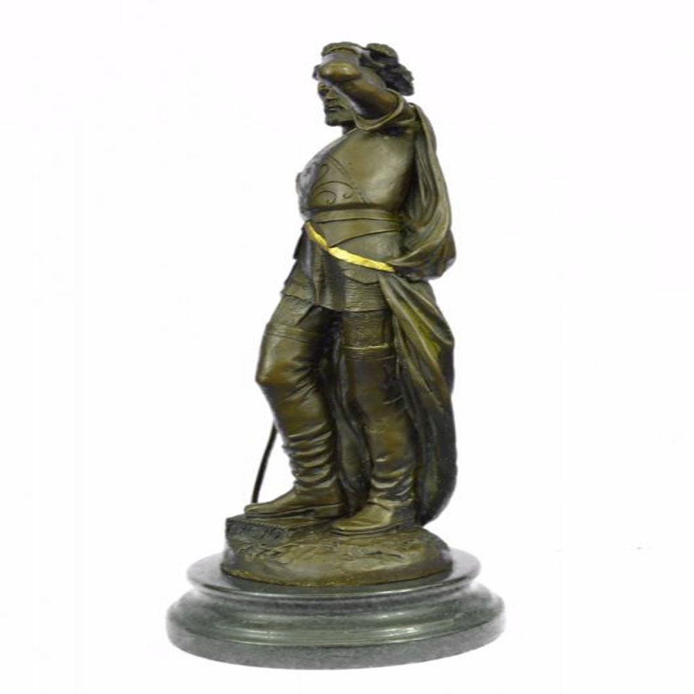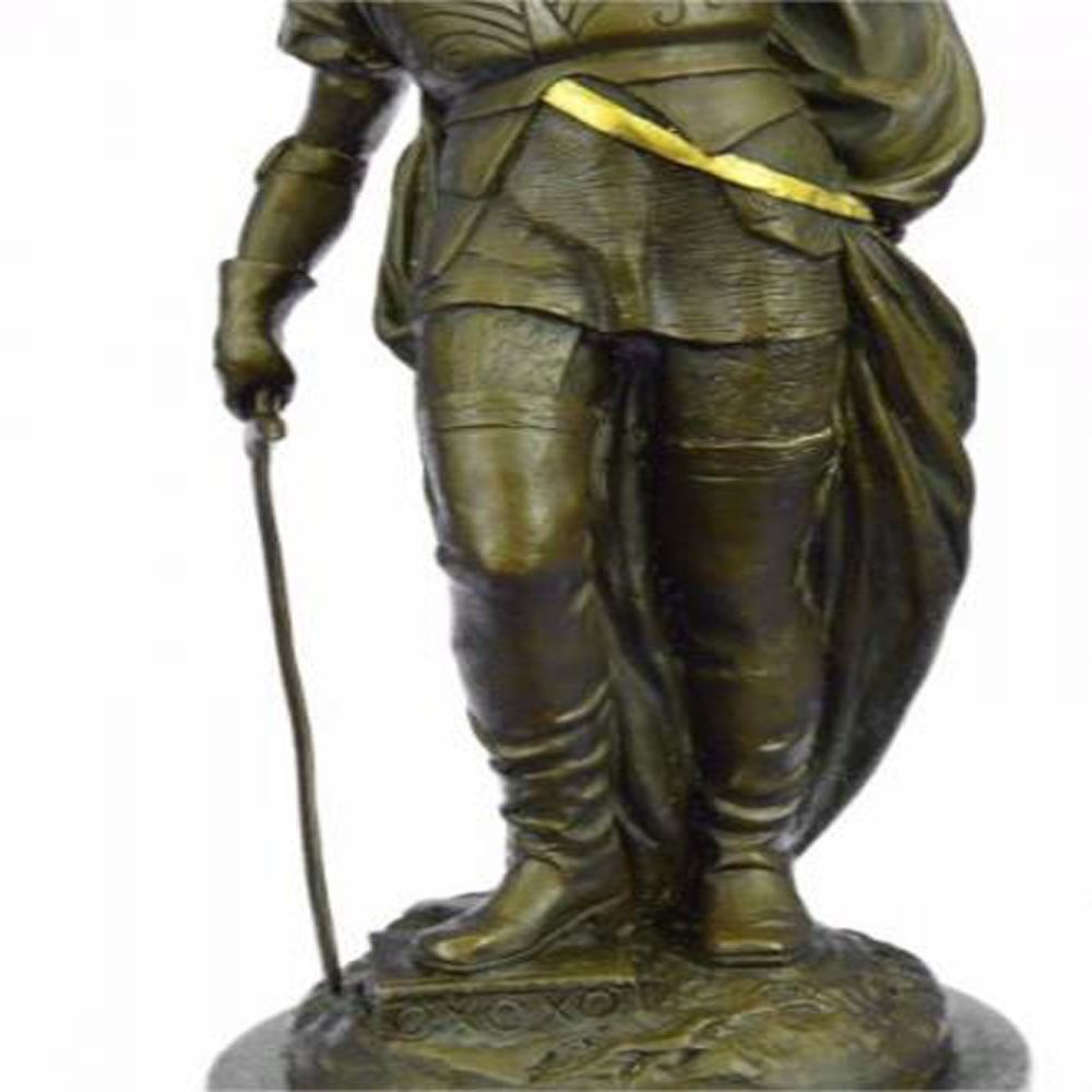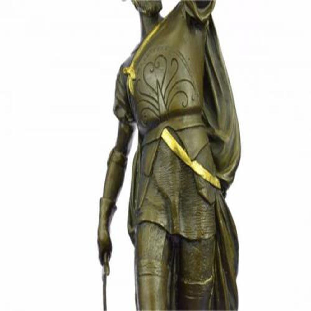 The Roman legion soldier stands looking to the horizon of a scarred battlefield. He is wearing some of the soldiers regalia. Atop of his head he wears a galea, which is a soldiers hat. Down his back falls a paludamentum, which is a long cloak fastened over one shoulder, usually signifying the commanders status. Around his waist he wears a tunic which is customary for soldiers to have it a little above the knee. In his right hand he carries a sword used in offense. The Bronze handmade Sculpture was cast using the ancient method of lost wax casting and stained with a brown and gold patina finish for preservation. It is mounted upon a marble base. Bronze Dimensions with Marble Base: Height 15 X Width 7 inches. Weight: 11 LBS.