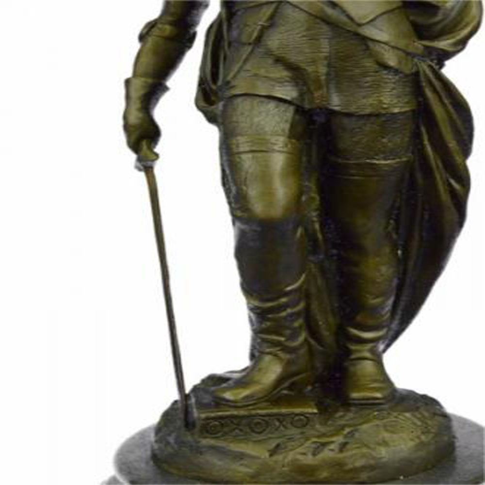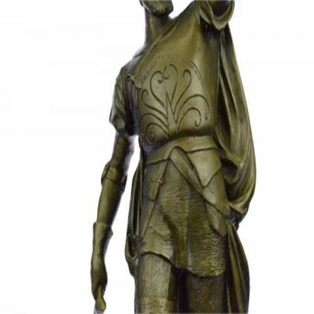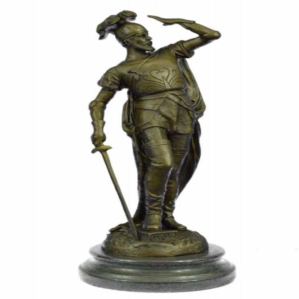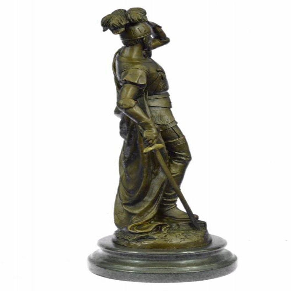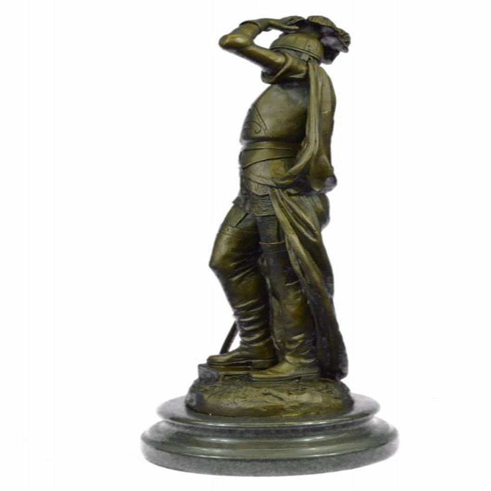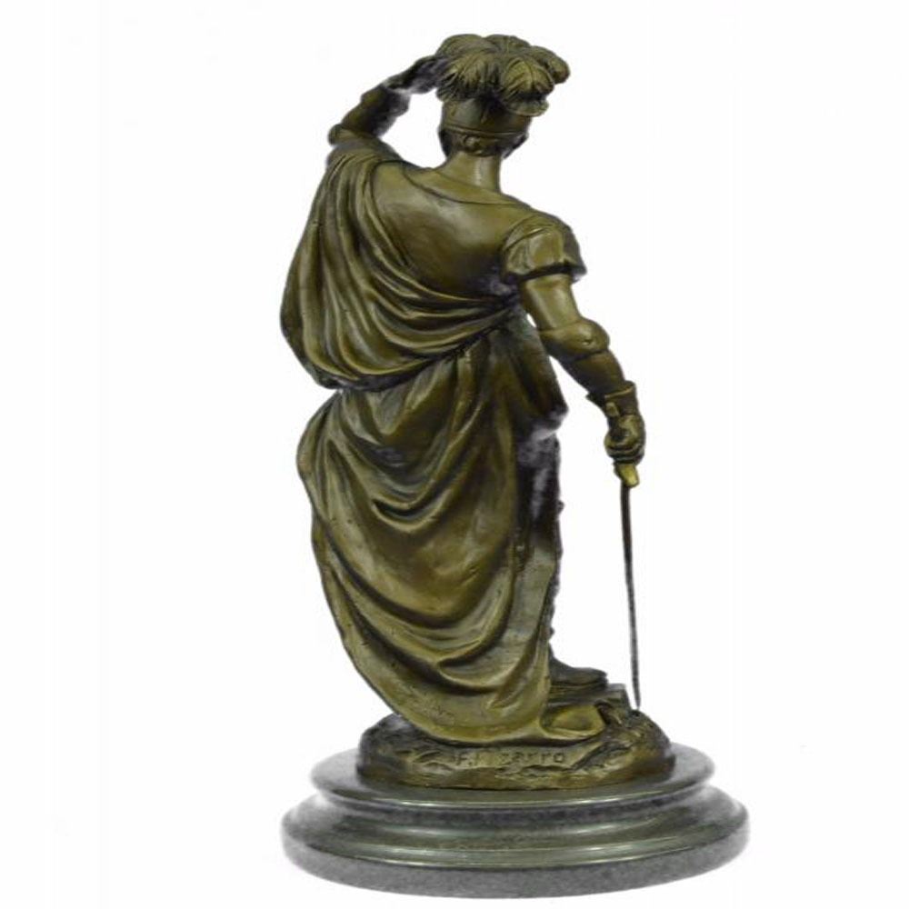 The Roman legion soldier stands to look to the horizon of a scarred battlefield. He is wearing some of the soldier's regalia. Atop his head, he wears a galea, which is a soldiers hat. Down his back falls a paludamentum, which is a long cloak fastened over one shoulder, usually signifying the commanders status. Around his waist, he wears a tunic which is customary for soldiers to have it a little above the knee. In his right hand, he carries a sword used in the offense. The Bronze handmade Sculpture was cast using the ancient method of lost wax casting and stained with a brown patina finish for preservation and it is mounted upon a marble base. Bronze Dimensions with Marble Base: Height 15 X Width 7 inches. Weight: 11 LBS.