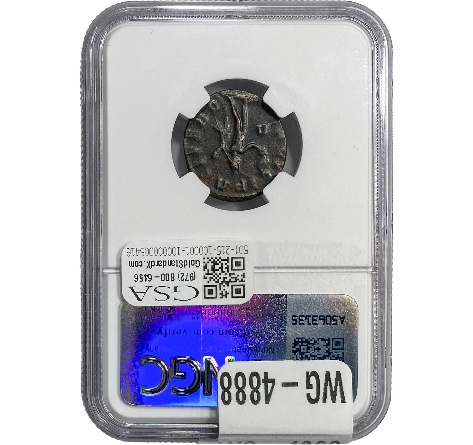 e. Coins sold referencing a third-party grading service are sold “AS IS” without any express or implied warranty, except for a guarantee by GSA that they are genuine. Removal or alteration of the holder, voids all of Bidder’s claims concerning that Product. Certain warranties may be available from the grading services and Bidders are referred to them for further details: Numismatic Guaranty Corporation (NGC), PO Box 4776, Sarasota, FL 34230, www.ngccoin.com/services/writtenguarantee.asp; Professional Coin Grading Services (PCGS), PO Box 9458, Newport Beach, CA 92658, www.pcgs.com/guarantee.html; ANACS, 6555 S. Kenton St., Ste. 303, Englewood, CO 80111; and Independent Coin Grading Co. (ICG), 7901 East Bellview, Ave., Suite 50, Englewood, CO 80111.