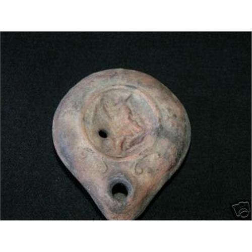 One sale is a very rare "Roman Oil Lamp" circa 100 A.D. to 300 A.D. This red clay mold, teardrop shaped lamp features a fill hole and a nozzle with remnants of carbon deposit. The outer top portion of the lamp is a decorated with two sets of four circles and two bow designs. Within the raised circular center of the lamp is the god Saturn holding a scythe. Saturn was the Roman god of agriculture and fertility. In the honor of the god Saturn the Romans celebrated the Saturnalia on December 17th by feasting and gift giving. This quality earthenware specimen is in excellent condition.