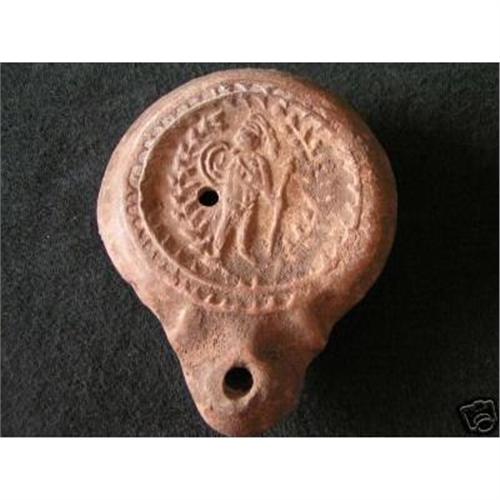 On sale is a very rare "Roman Oil Lamp" circa 100A.D. to 300 A.D. This clay mold lamp features an arrow style nozzle and fill hole. The outer discus portion of the lamp is adorned with chevrons and two laurel branches. At the center is a Roman soldier wearing a plumed helmet holding his shield and spear. On the reverse is a circular raised base. This quality specimen in excellent condition.