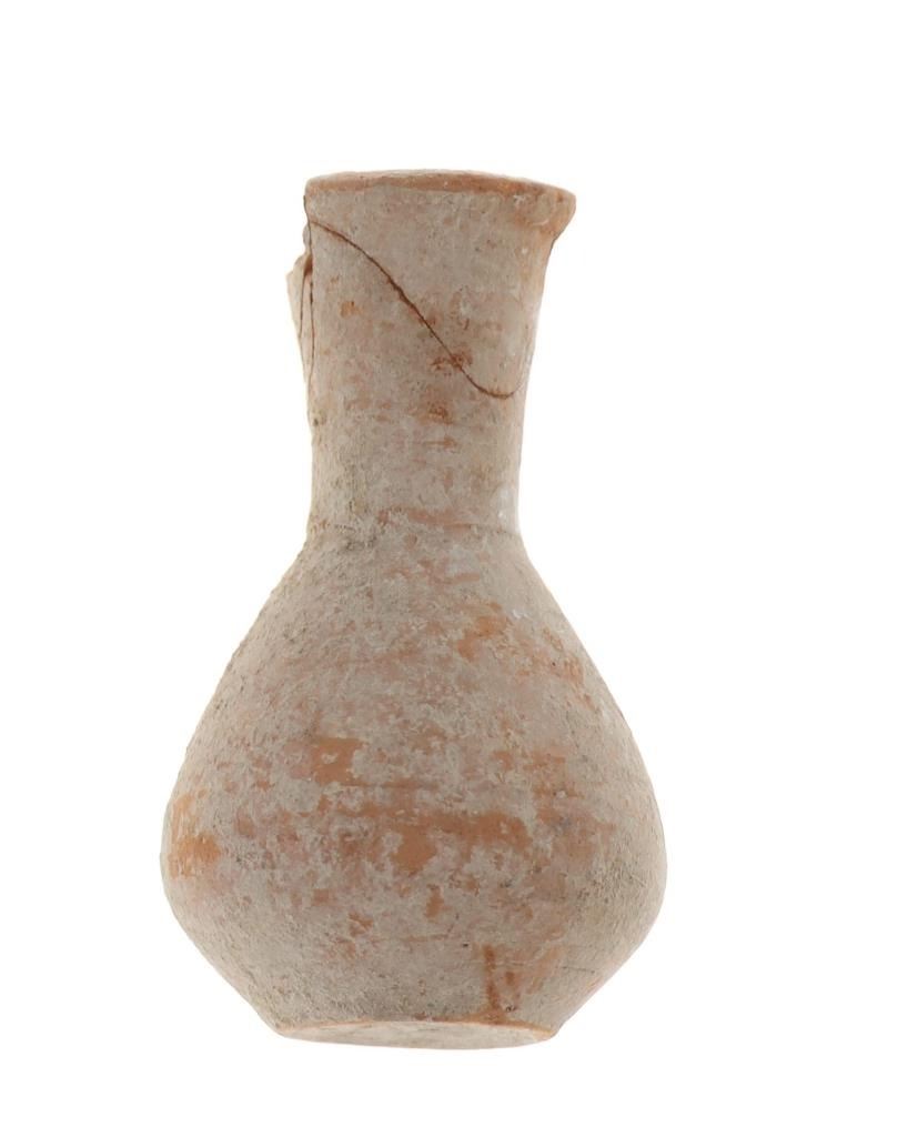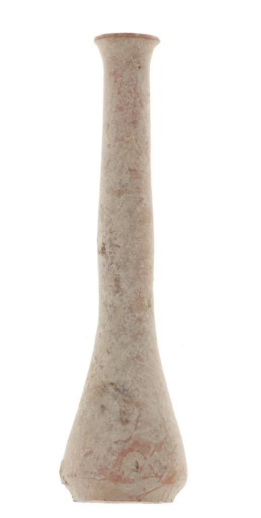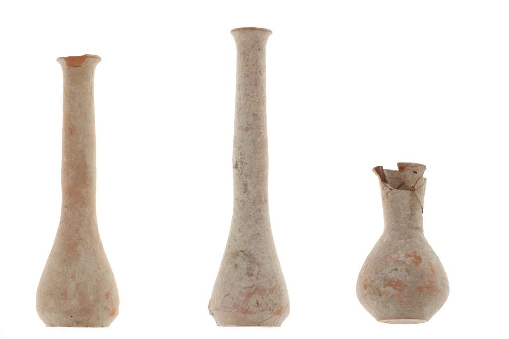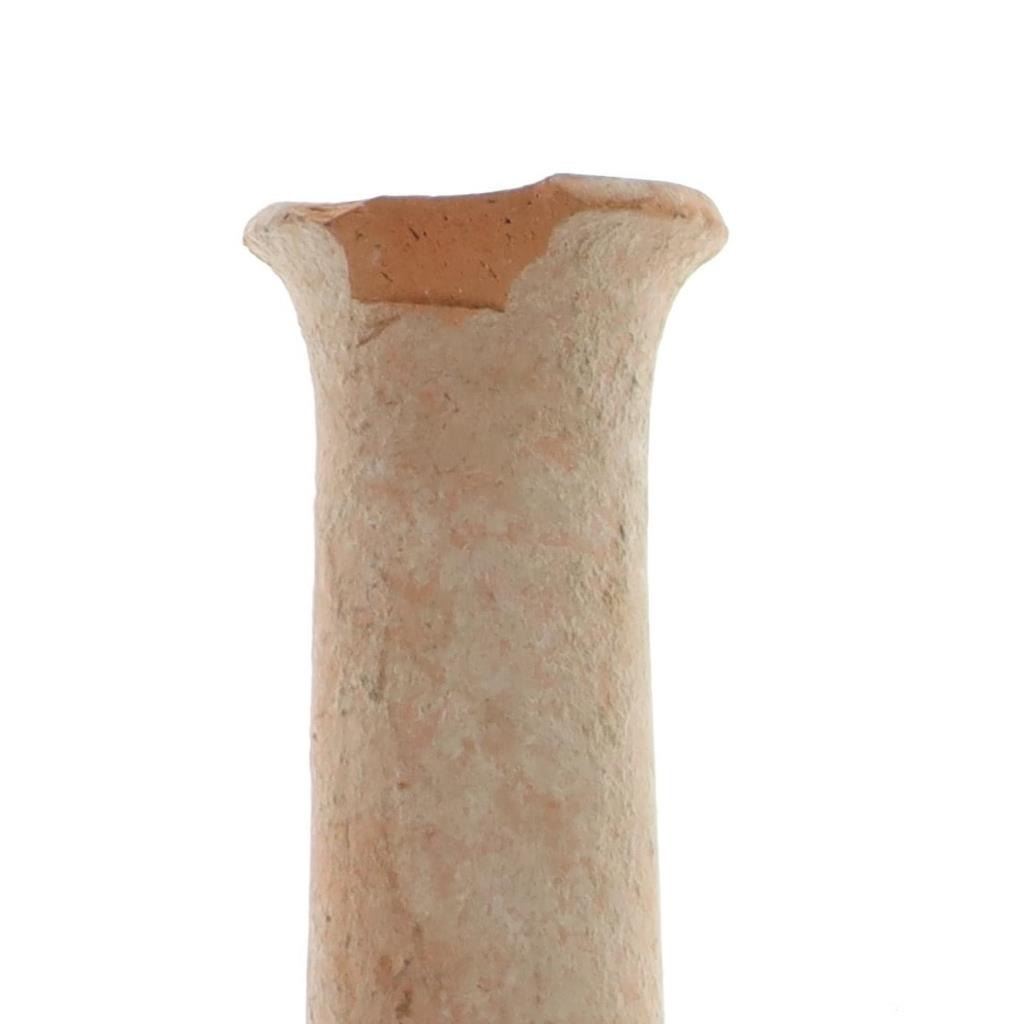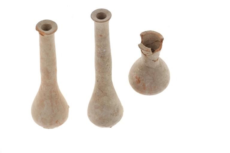 Presented in this lot are three (3) Roman Period Terracotta Unguentariums, circa 1st century BC-1st century AD. Provenance: Private collection Big Sky, Montana. An unguentarium, also referred to as Balsamarium, Lacrimarium or tears vessel, is a small ceramic or glass bottle found frequently by archaeologists at Hellenistic and Roman sites, especially in cemeteries. An unguentarium is a small bottle used for ointments, perfumes, balms, and other liquids associated with the toilet. Vessels typically have a bulbous bottom and narrow, tubular neck, but lack handles. Bulbous-bottomed, glass unguentaria were one of the earliest shapes to be made using the glassblowing technique. The term unguentarium is functional rather than descriptive; that is, it refers to the purpose for which this relatively small vessel is thought to have been used and is not typological by shape. In its early development, the shape was modeled in miniature after larger amphoras, which would have been the original bulk shipping containers for products sold in the unguentaria. Unguentaria were used as product packaging in commerce and for funerary practice. They are distributed throughout the Mediterranean region of the Roman Empire from Israel to Spain and north into Britain and Germania. Their manufacture was nearly as widespread. It has been suggested that products shipped in bulk containers were dispensed for sale in these smaller vessels. Perfumed oils, ointments, balsam, jasmine, kohl, honey, mastic, incense, and scent powders and cosmetic preparations are among the contents proposed by scholars or evidenced by archaeology.