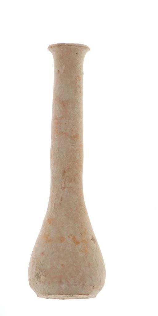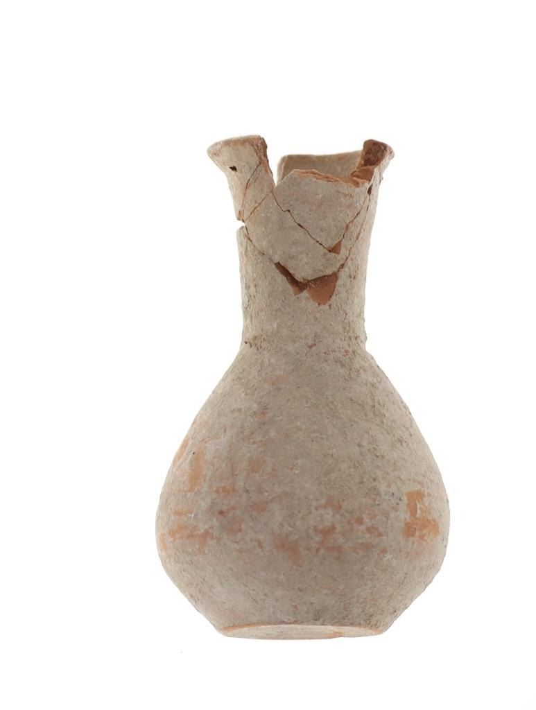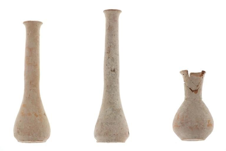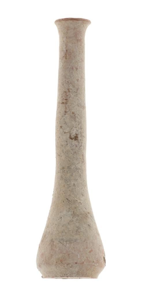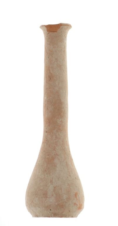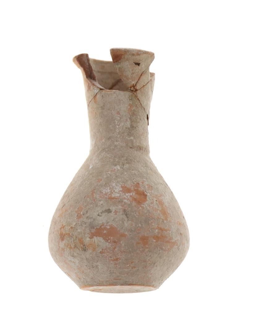 Presented in this lot are three (3) Roman Period Terracotta Unguentariums, circa 1st century BC-1st century AD. Provenance: Private collection Big Sky, Montana. An unguentarium, also referred to as Balsamarium, Lacrimarium or tears vessel, is a small ceramic or glass bottle found frequently by archaeologists at Hellenistic and Roman sites, especially in cemeteries. An unguentarium is a small bottle used for ointments, perfumes, balms, and other liquids associated with the toilet. Vessels typically have a bulbous bottom and narrow, tubular neck, but lack handles. Bulbous-bottomed, glass unguentaria were one of the earliest shapes to be made using the glassblowing technique. The term unguentarium is functional rather than descriptive; that is, it refers to the purpose for which this relatively small vessel is thought to have been used and is not typological by shape. In its early development, the shape was modeled in miniature after larger amphoras, which would have been the original bulk shipping containers for products sold in the unguentaria. Unguentaria were used as product packaging in commerce and for funerary practice. They are distributed throughout the Mediterranean region of the Roman Empire from Israel to Spain and north into Britain and Germania. Their manufacture was nearly as widespread. It has been suggested that products shipped in bulk containers were dispensed for sale in these smaller vessels. Perfumed oils, ointments, balsam, jasmine, kohl, honey, mastic, incense, and scent powders and cosmetic preparations are among the contents proposed by scholars or evidenced by archaeology.