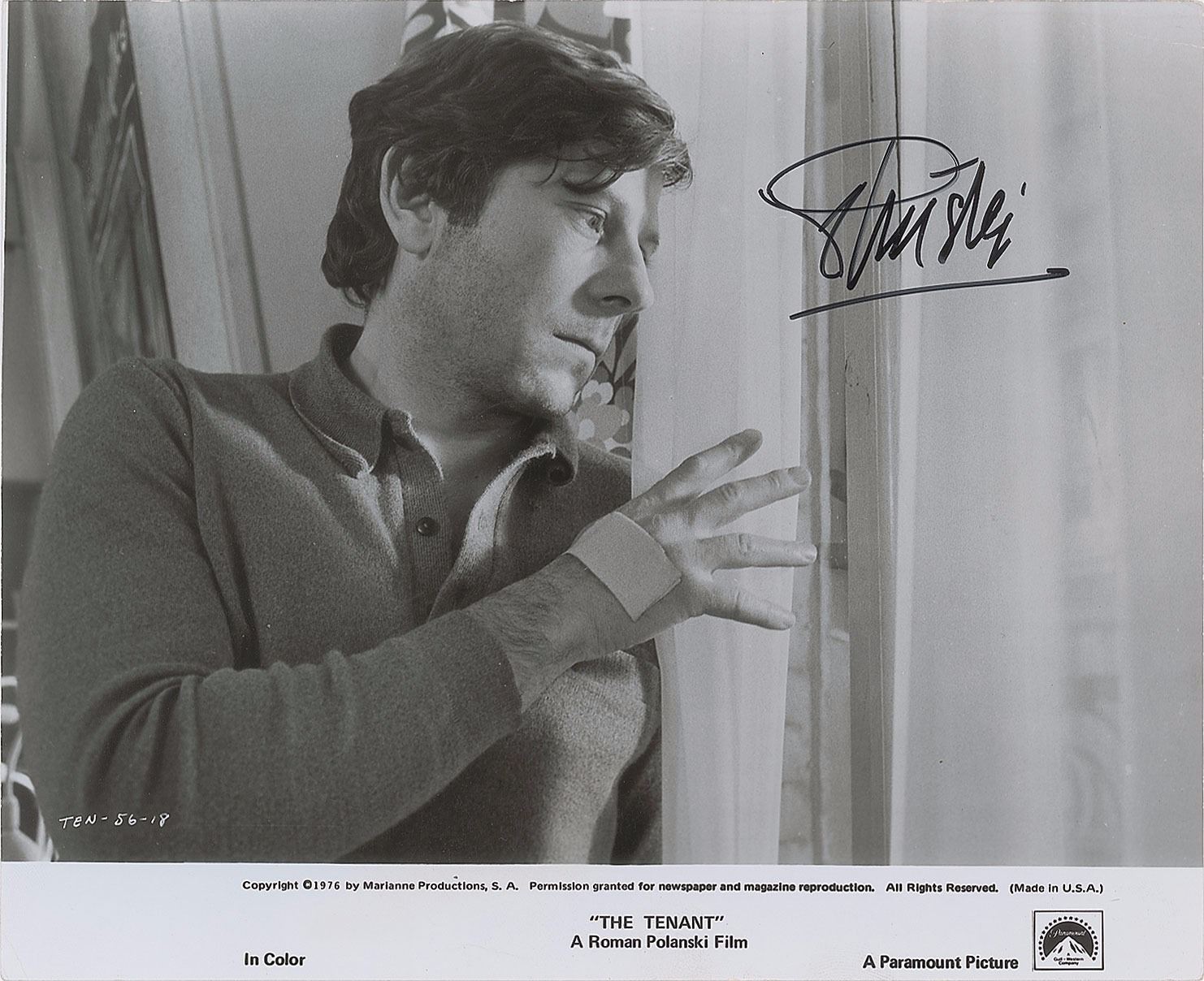 Glossy 10 x 8 Paramount Pictures publicity photo of Roman Polanski as the suspicious Trelkovsky in the 1976 film The Tenant, signed in black felt tip. Reverse bears a "DEW Cinema Collection" stamp. In fine condition, with scattered light creasing. From the Harvey and Rhoda Kuflik Collection.