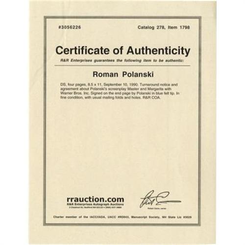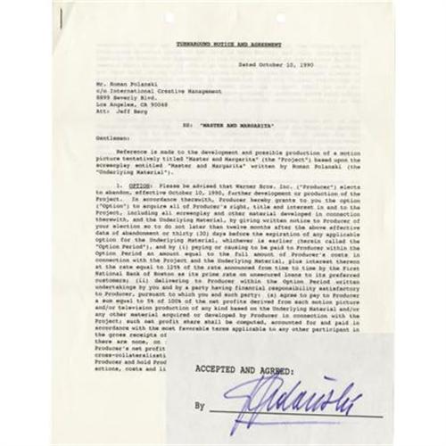 <B>Roman Polanski Signed Turnaround Notice.</B></I> A four-page agreement between Warner Bros. and Polanski, dated October 10, 1990, in which the studio opted to abandon further development on the filmmaker's script <I>Master and Margarita.</B></I> Signed on the last page by Polanski in blue felt tip, in Excellent condition with the usual binder holes and mailing creases. <I>Accompanied by a certificate of authenticity.</B></I> <I>Accompanied by LOA from PSA/DNA.</B></I><BR><BR><b>Shipping:</b> Flat Material, Small (<a target="_blank" href="http://www.heritageauctions.com/common/shipping.php">view shipping information</a>)