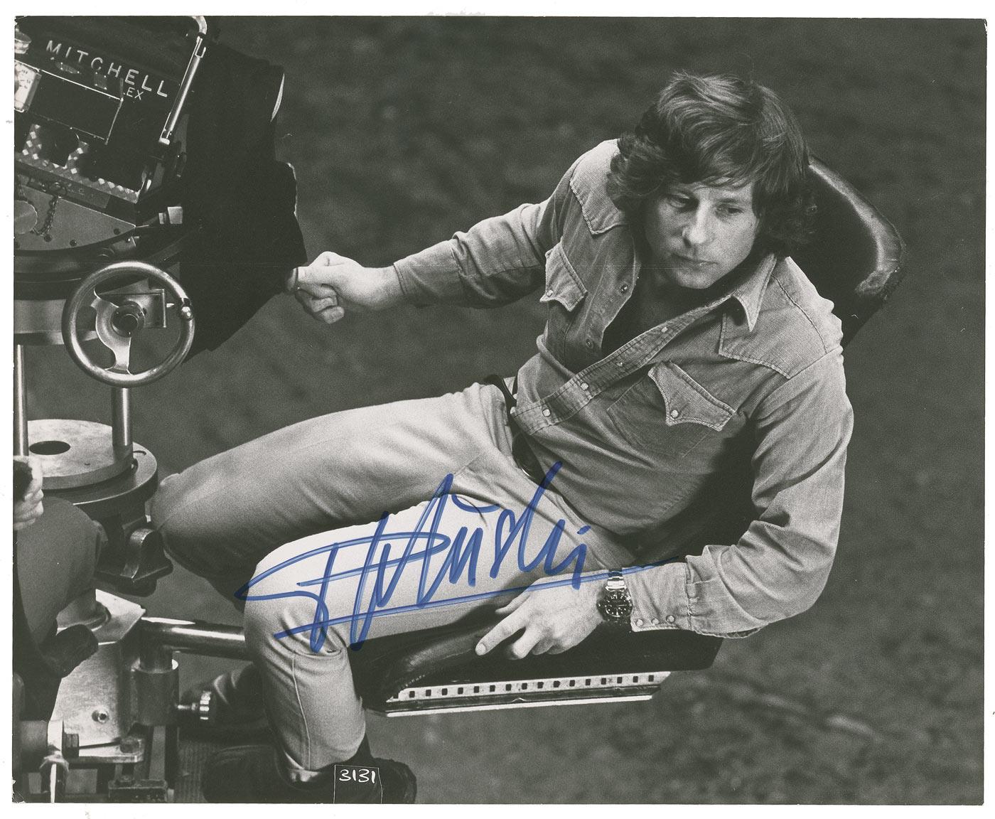 Glossy 10 x 8 photo of Polanski behind a camera, signed in blue felt tip. In fine condition, with light surface impressions from collector’s notations on reverse and a few trivial creases.