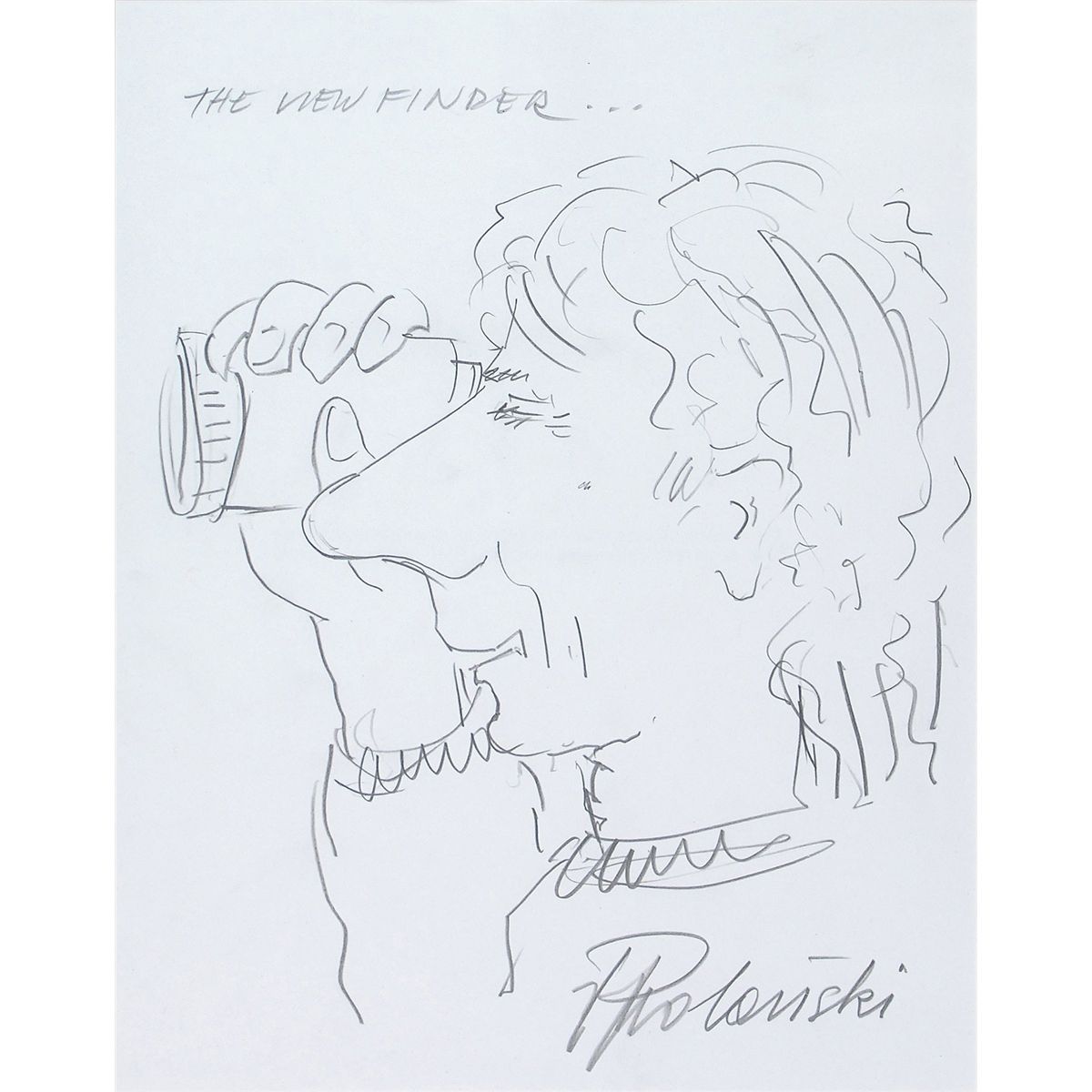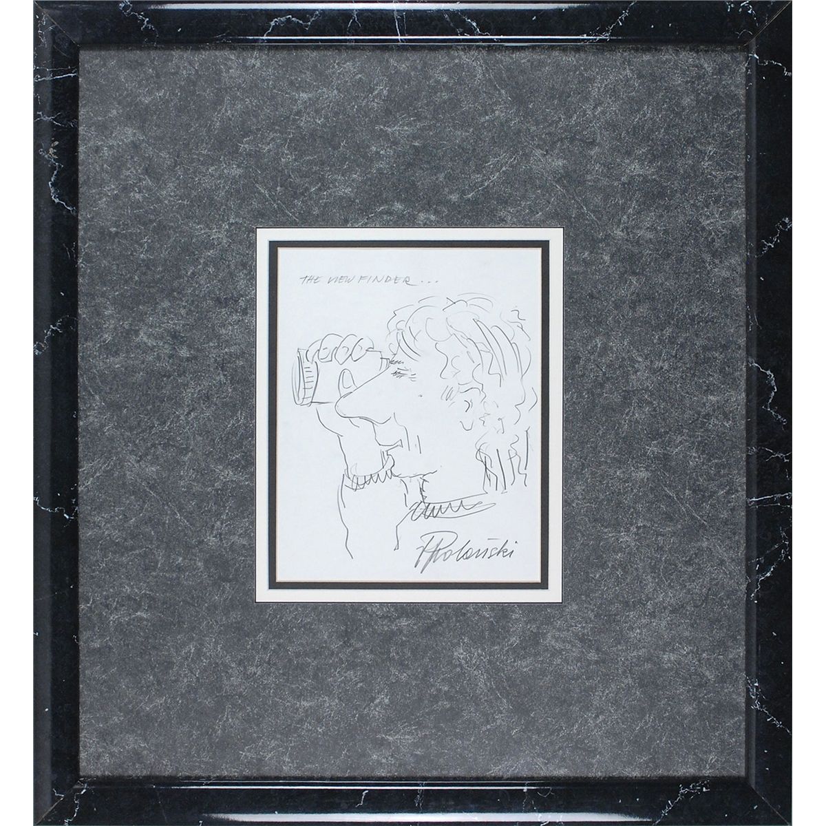Original signed pencil self-portrait profile of himself looking through a camera lens on a white 7.75 x 10 sheet, signed “The view finder, R. Polanski.” Triple-matted and framed to an overall size of 22.5 x 24.5. In very fine condition. Oversized.