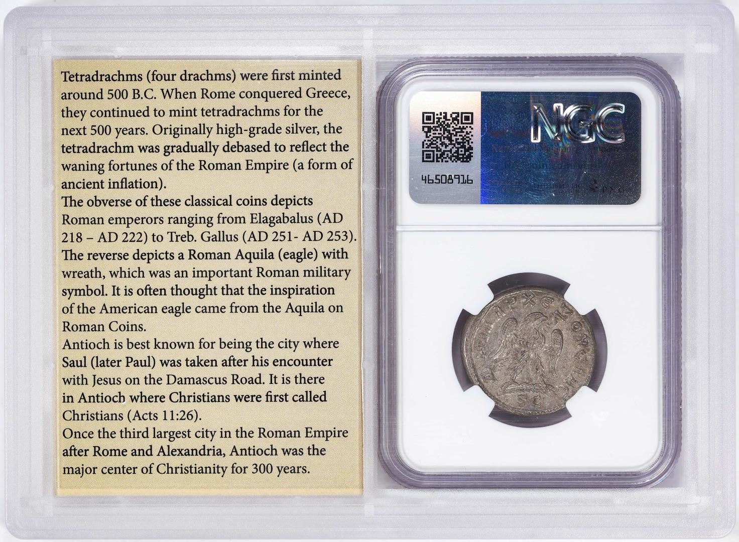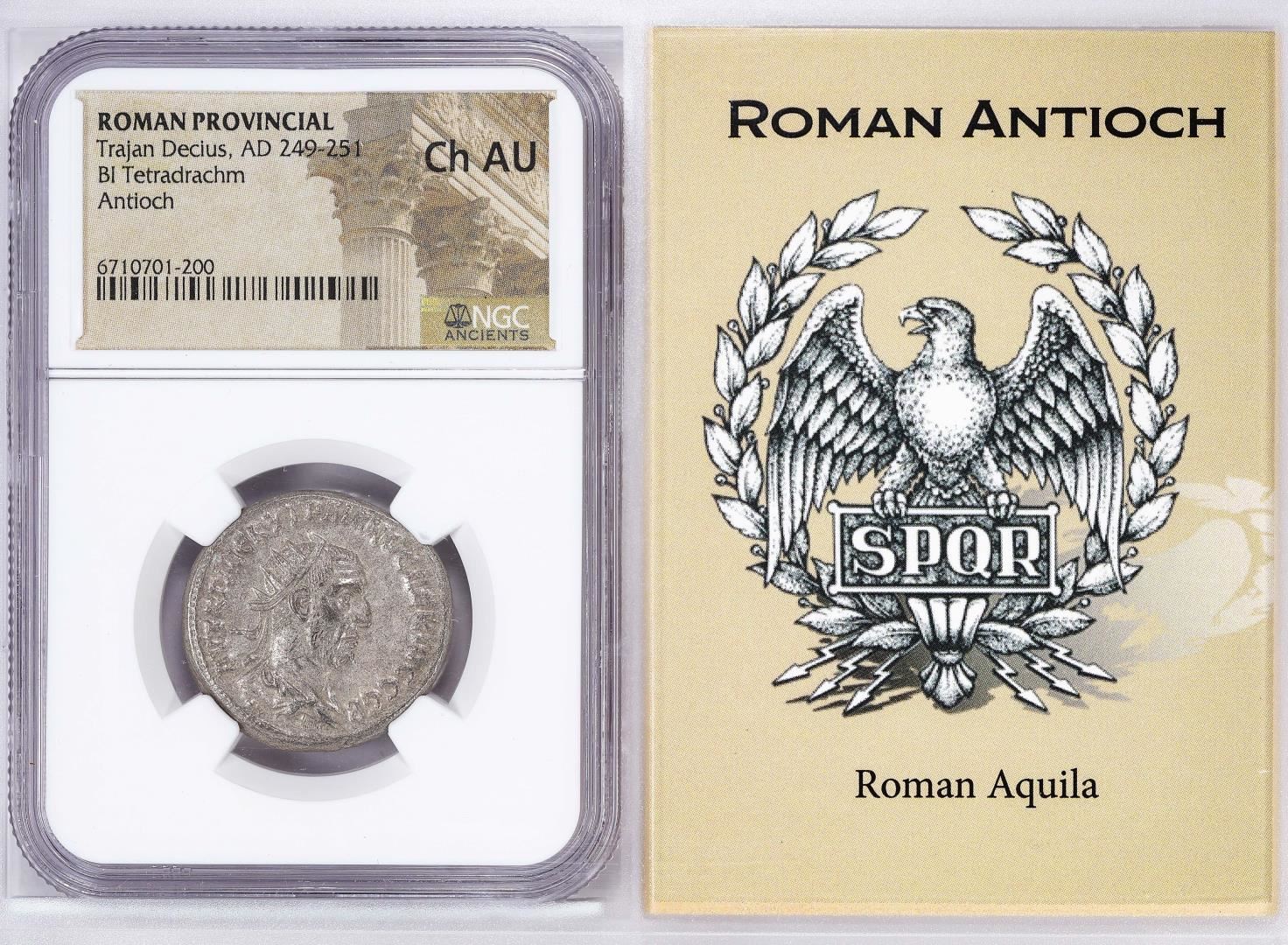 Roman Provincial 249-251 AD Decius Bi Tetradrachm Ancient Coin NGC Ch AU Story Box