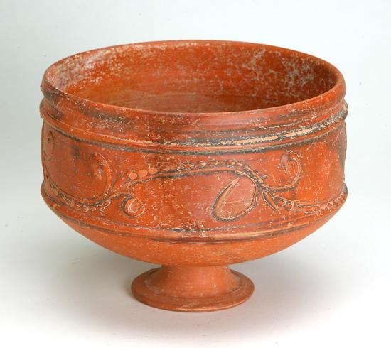 Roman Red Gloss Ware Pottery Bowl. Circa 2nd century AD. Beautiful reddish-orange 'en barbotine' relief frieze displaying a continuous foliate garland. Intact, free from repairs. Diameter: 6". Height: 5".