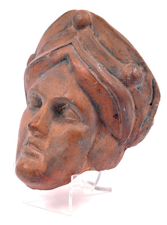 Roman Red Terracotta Mask, c. 4th Century A.D. Head of a female goddess. Height 4½". Choice condition.