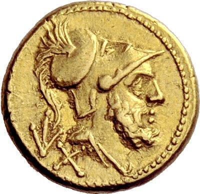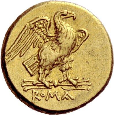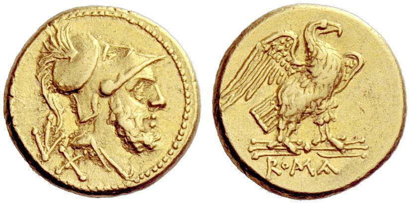 The Roman Republic. 60 asses after 211, AV 3.36g. Bearded and draped head of Mars r., wearing Corinthian helmet; in l. field, mark of value, X. Rev. Eagle standing r., with spread wings, on thunderbolt. Below, ROMA. Bahrfeldt 4. Sydenham 226. Crawford 44/2. Extremely fine
