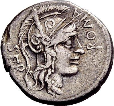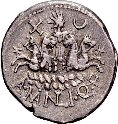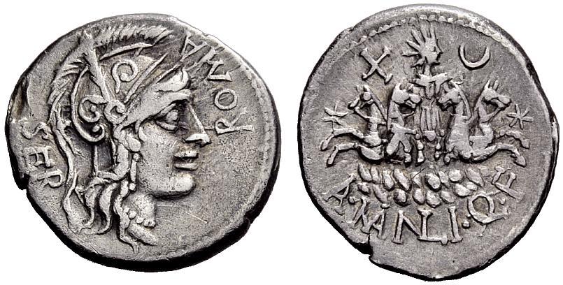 The Roman Republic. A. Manlius Q.f. Denarius ca. 118-107, AR 3.82g. ROMA–SER Helmeted head of Roma r.; bowl decorated with plumes. Rev. Facing quadriga of Sol over waves; on either side, star. In upper field, X and crescent. In exergue, A·MANLI·Q·F. Babelon Manlia 1. Sydenham 543. Crawford 309/1. Very rare. Lightly toned and very fine
