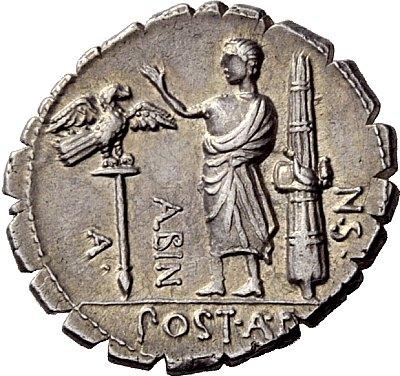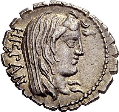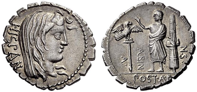The Roman Republic. A. Postumius A. f. Sp. n. Albinus. Denarius serratus 81, AR 3.89g. HISPAN Veiled bust of Hispania r. Rev. A·POST·A·F·S·N·ALBIN Togate figure, with r. hand raised, standing l. between legionary eagle and fasces with axe. Babelon Postumia 8. Sydenham 746. Crawford 372/2. Extremely fine