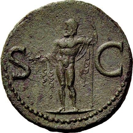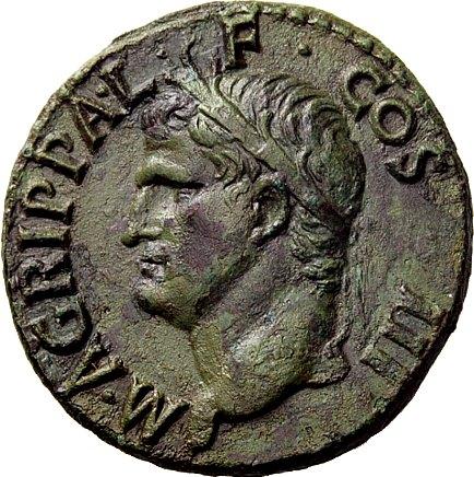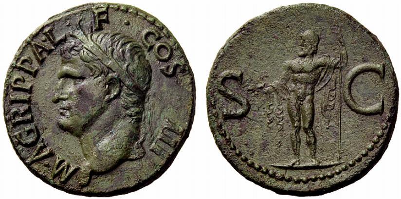 The Roman Republic. In the name of Agrippa. As ca. 37, Æ 10.24g. Laureate head l. Rev. Neptune standing l. holding cock and sceptre. C 3. BMC Gaius 161. RIC Gaius 58. CBN Gaius 78. Green patina and about extremely fine