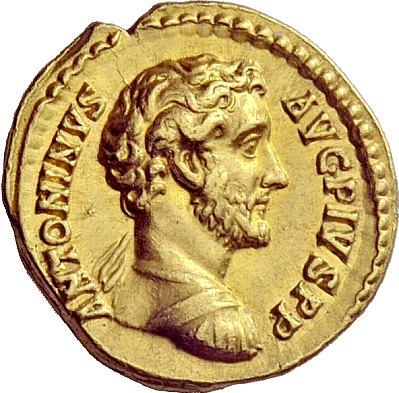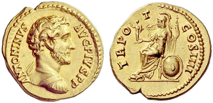 The Roman Republic. Antoninus Pius augustus, 138–161. Aureus 145, AV 7.25g. Bare-headed and cuirassed bust r., with drapery on l. shoulder. Rev. Roma seated l., holding Victory and spear; at side, shield. C 396. BMC 555. RIC 147. Calicó 1654a About extremely fine