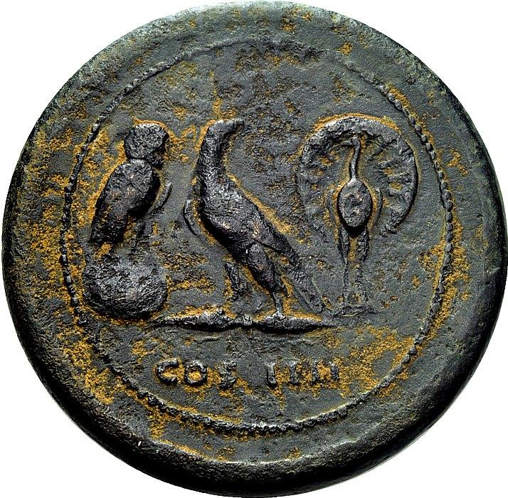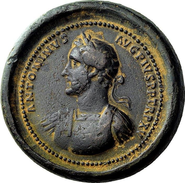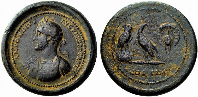 The Roman Republic. Antoninus Pius augustus, 138–161. Medallion 151-152, Æ 65.42g. Laureate and cuirassed bust l. Rev. Eagle standing l. on thunderbolt, head l.; to l., owl standing r. on shield; to r., peacock facing. C 341. Gnecchi pl. 45,9. Very rare. An impressive medallion struck on a broad flan with a dark tone. Very fine. Ex Superior 31 May 1988, 1934 and NAC 10, 1988, 389 sales.