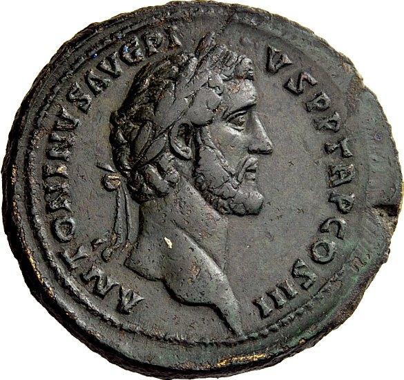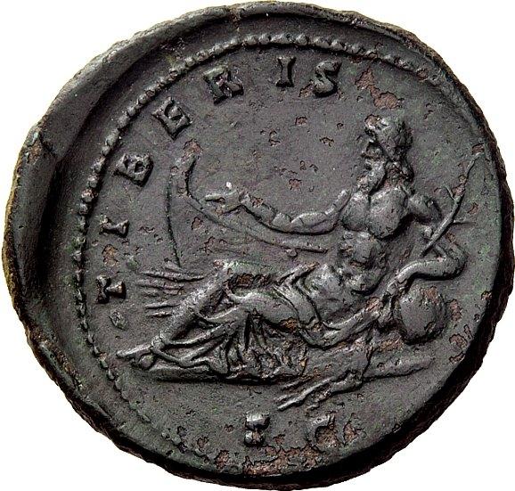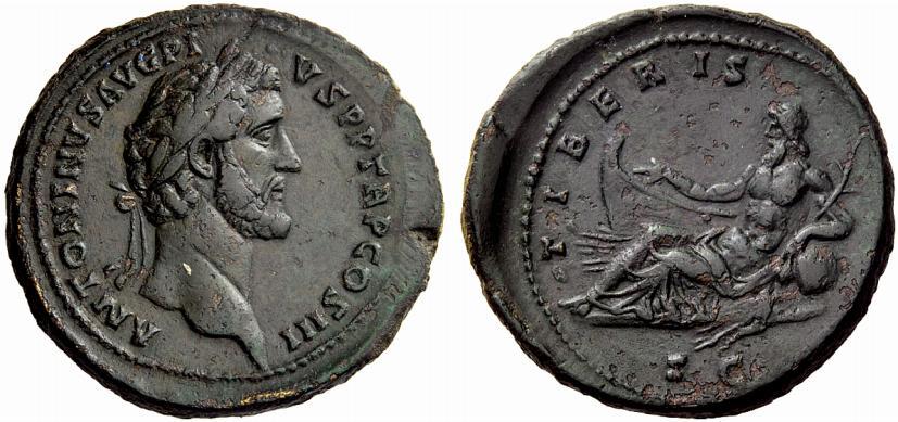 The Roman Republic. Antoninus Pius augustus, 138–161. Sestertius 140-144, Æ 25.91g. Laureate head r. Rev. Tiber, crowned with reeds, reclining l. and leaning on urn which pours out water; his r. hand resting on ship as he holds reed in l. C 819. BMC 1314. RIC 612a. Rare and in unusually good condition for the issue. Dark green patina and about extremely fine. Ex NAC sale 52, 2009, 442.