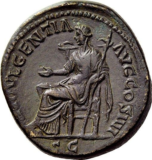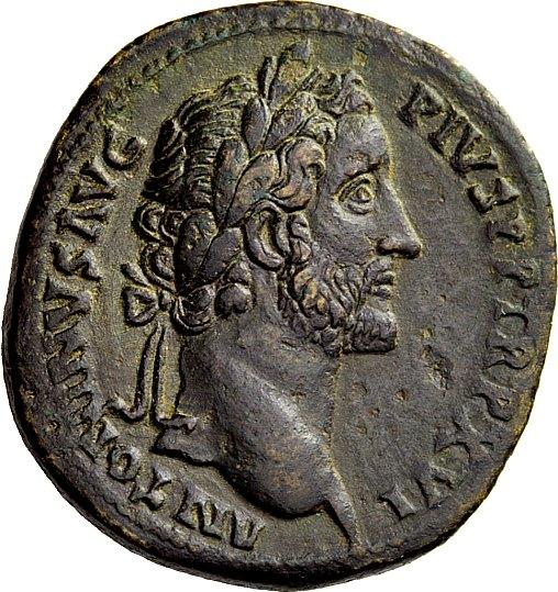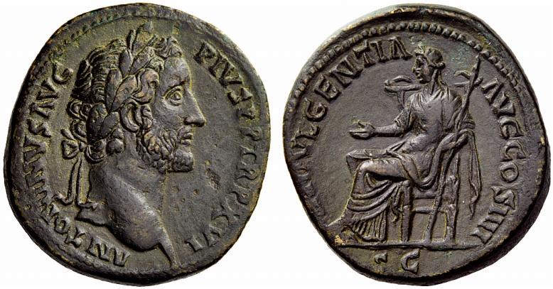 The Roman Republic. Antoninus Pius augustus, 138–161. Sestertius 152-153, Æ 22.85g. Laureate head r. Rev. Indulgentia seated l., holding transversal sceptre in l. hand and extending r. C 452. BMC 1920. RIC 904. Green patina, good very fine