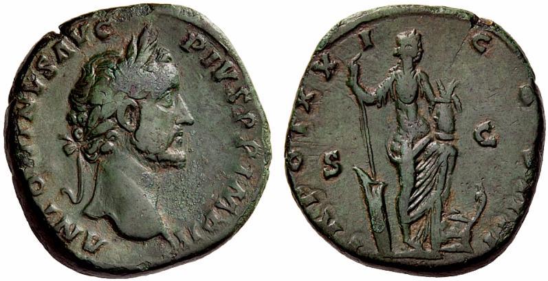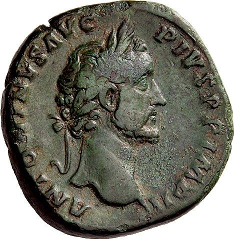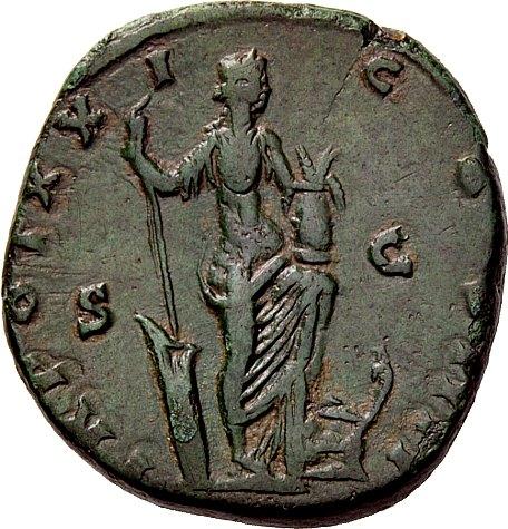 The Roman Republic. Antoninus Pius augustus, 138–161. Sestertius 157-158, Æ 23.77g. Laureate head r. Rev. Annona standing r., holding rudder in r. hand and modius with corn ears balanced on l. knee in l.; l. foot set on prow. C –. BMC 2037. RIC 981. Green patina, fine