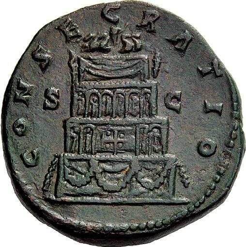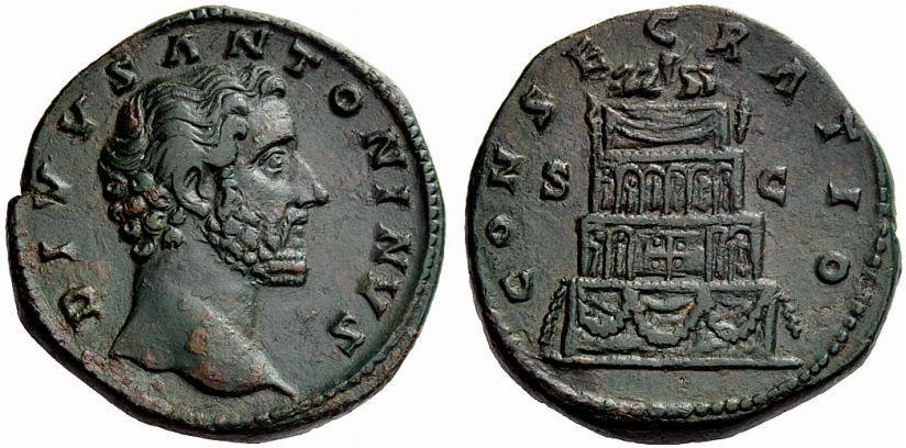 The Roman Republic. Antoninus Pius augustus, 138–161. Divus Antoninus. Sestertius after 161, Æ 24.06g. Bare head r. Rev. Four-tier pyre decorated with hangings and garlands and surmounted by facing quadriga. C 165. BMC M. Aurelius 872. RIC M. Aurelius 1266. Dark green patina and good very fine. Ex Lanz 128, 2006, 459 and NAC 52, 2009, 1110 sales.
