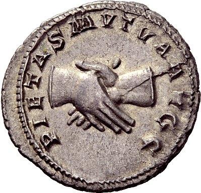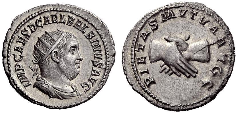The Roman Republic. Balbinus, 22nd Apr-29th Jul 238. Antoninianus April-June 238, AR 4.25g. Radiate, draped and cuirassed bust r. Rev. Clasping hands. C 17. BMC 74. RIC 12. About extremely fine
