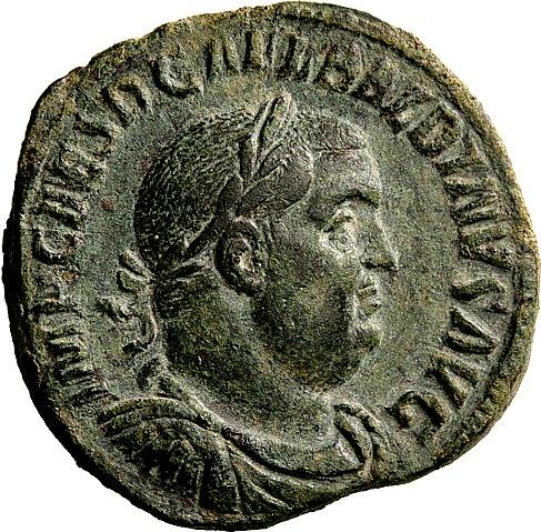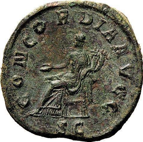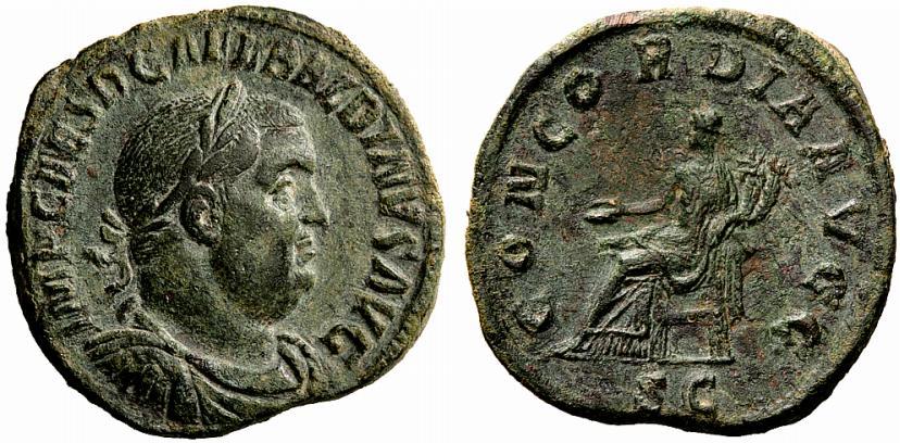 The Roman Republic. Balbinus, 22nd Apr-29th Jul 238. Sestertius April-June 238, Æ 20.38g. Laureate, draped and cuirassed bust r. Rev. Concordia seated l., holding out patera and double cornucopiae. C 4. BMC 18. RIC 22. A pleasant portrait. Nice green patina and about extremely fine