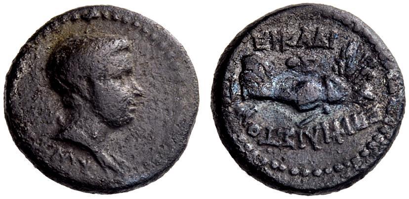 The Roman Republic. Britannicus, son of Claudius. Bronze, Smyrna Ioniae ca. 50-54, Æ 3.24g. Bare head r. Rev. Victory standing r., holding palm branch and trophy. BMC 284. RPC 2476. Very rare. About very fine