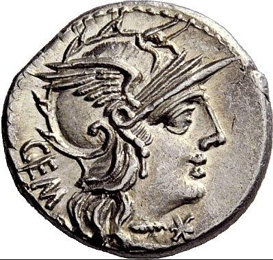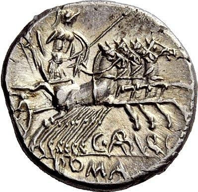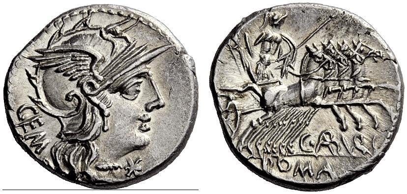 The Roman Republic. C. Aburius Geminus. Denarius 134, AR 3.93g. Helmeted head of Roma r.; below chin, Û. Behind, GEM. Rev. Mars in quadriga r., holding spear, shield, trophy and reins; below, C·ABVRI. In exergue, ROMA. Babelon Aburia 1. Sydenham 490. Crawford 244/1. Virtually as struck and almost Fdc