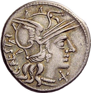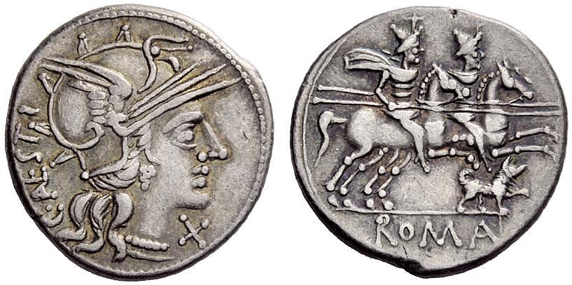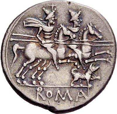 The Roman Republic. C. Antestius. Denarius 146, AR 3.57g. C·ANTEST–I Helmeted head of Roma r.; below chin, X. Rev. The Dioscuri galloping r.; below horses, puppy r. with l. forepaw raised. Below, ROMA in tablet. Babelon Antestia 1 var. Sydenham 411 var. Crawford 219/1d. A very rare variety. Lovely iridescent tone and about extremely fine
