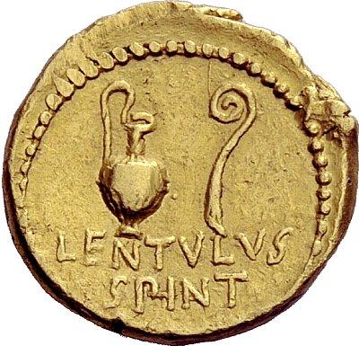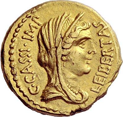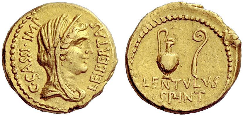 The Roman Republic, C. Cassius Longinus with Lentulus Spinther. Aureus, mint moving with Cassius (probably Smyrna) 43-42, AV 7.95 g. C·CASSI·IMP – LEIBERTAS Diademed and veiled bust of Vesta r., wearing necklace. Rev. LENTVLVS / SPINT Sacrifical vase and lituus. Bahrfeldt 59. Babelon Cassia 17. Sydenham 1304. Sear Imperators 222. Crawford 500/4. Kent-Hirmer pl. 27, 97. Calicó 66a. Very rare. Struck on a full flan and good very fine Ex Tkalec sale 2001, 232.