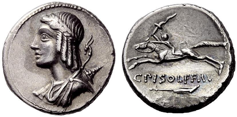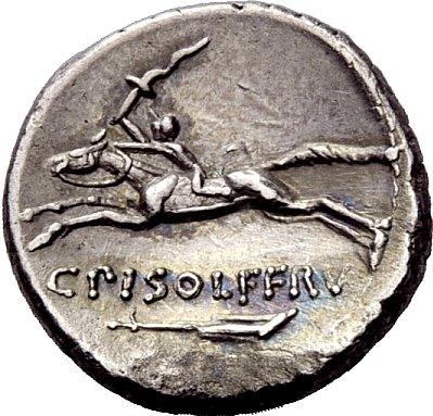 The Roman Republic. C. Calpurnius L.f. Frugi. Denarius 67, AR 3.49g. Laureate and draped bust of Apollo l., bow and quiver over r. shoulder. Rev. Horseman galloping l., holding torch; below, C·PISO·L·FRV / rudder. Babelon Calpurnia 29. Sydenham 878. Crawford 408/1b. Very rare. Abrasion at six o’clock on reverse field, otherwise extremely fine