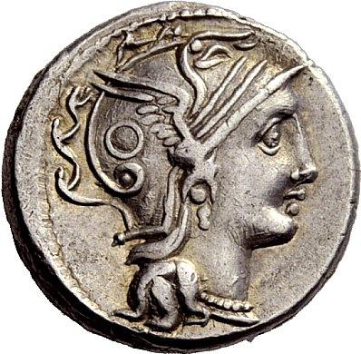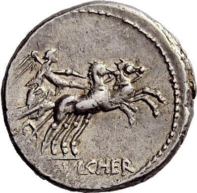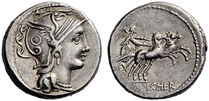 The Roman Republic. C. Claudius Pulcher. Denarius 110 or 109, AR 3.97g. Helmeted head of Roma r., bowl decorated with annulet. Rev. Victory in biga r. Babelon Claudia 1. Sydenham 569. Crawford 300/1. About extremely fine. Ex NAC sale 52, 2009, 805.