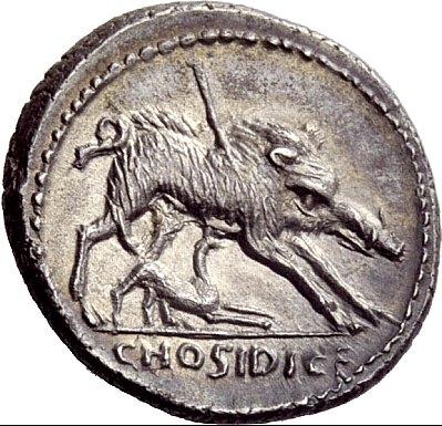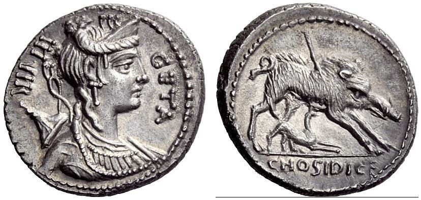 The Roman Republic. C. Hosidius C.f. Geta. Denarius 68, AR 4.08g. GETA–III·VIR Diademed and draped bust of Diana r., with bow and quiver over shoulder. Rev. Boar r. wounded by spear and attacked by hound; in exergue, C·HOSIDI C F. Babelon Hosidia 1. Sydenham 903. Crawford 407/2. Lightly toned, virtually as struck and almost Fdc. Ex NAC sale 15, 1999, 130.
