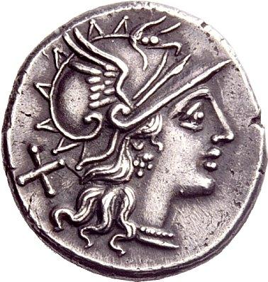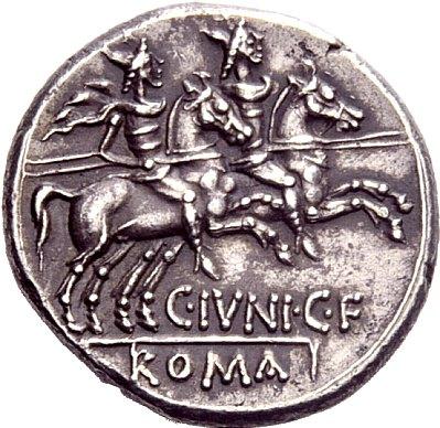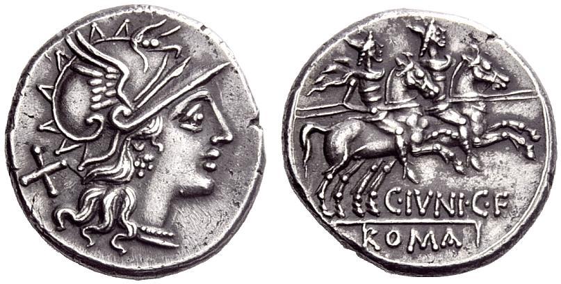 The Roman Republic. C. Junius C.f. Denarius 149, AR 3.74g. Helmeted head of Roma r., behind, X. Rev. The Dioscuri galloping r.; below horse, C·IVNI·C·F. In exergue, ROMA. Babelon Junia 1. Sydenham 392. Crawford 210/1. Old cabinet tone, insignificant test cut at two o’clock on obverse, otherwise good extremely fine