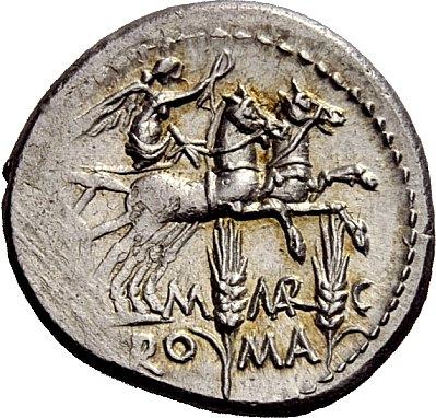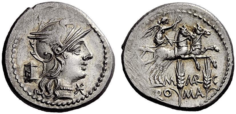 The Roman Republic. C. Marcius Mn. f. Denarius 134, AR 3.92g. Helmeted head of Roma r.; below chin, Ú. Behind, modius. Rev. Victory in biga r., holding reins and whip. Babelon Marcia 8. Sydenham 500. Crawford 245/1. A minor area of weakness on reverse, otherwise good extremely fine