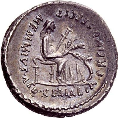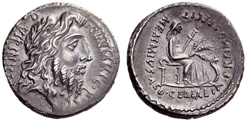 The Roman Republic. C. Memmius C.f. Denarius 56, AR 3.83g. C·MEMMI·C·F·â€“QVIRINVS Laureate head of Quirinus r. Rev. MEMMIVS·AED·CERIALIA·PREIMVS·FECIT Ceres seated r., holding torch in l. hand and corn ear in r.; at her feet, snake. Babelon Memmia 9. Sydenham 921. Crawford 427/2 Old cabinet tone and extremely fine. Ex NAC sale 29, 2005, 369.