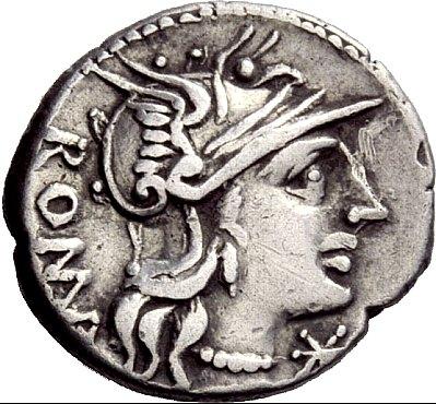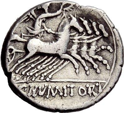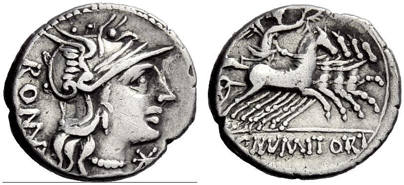 The Roman Republic. C. Numitorius. Denarius 133, AR 2.95g. Helmeted head of Roma r.; behind, ROMA and below chin, Û. Rev. Victory in prancing quadriga r.; in exergue, C·NVMITORI. Babelon Numitoria 1. Sydenham 466. Crawford 246/1. Extremely rare. Minor marks on cheek, otherwise very fine