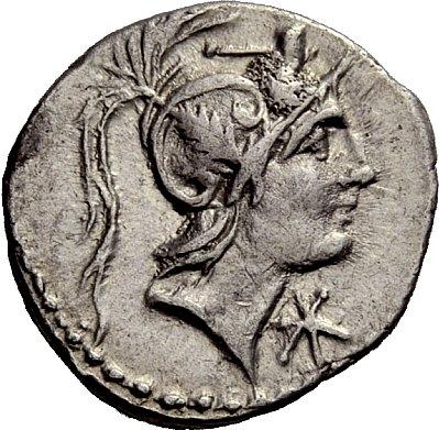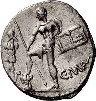 The Roman Republic. C. Poblicius Malleolus. Denarius 94, AR 3.91g. Helmeted head of Mars r.; above hammer. Below chin, Û. Rev. Naked warrior standing l., holding spear in r. hand and placing r. foot on cuirass; on l., trophy and on r., tablet inscribed P.; below, C·MAL. Babelon Poblicia 7. Sydenham 615/5c. Crawford 335/3g. Rare. Good very fine / about extremely fine. Ex NAC sale 27, 2004, 249.