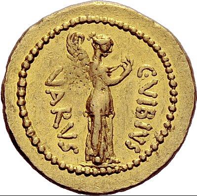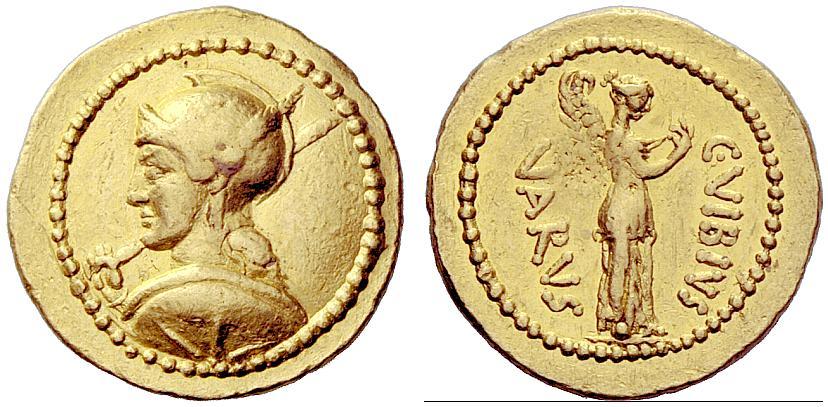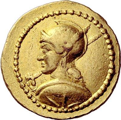 The Roman Republic. C. Vibius Varus. Aureus 42, AV 8.06g. Bust of Roma l., wearing helmet with a plume on each side, holding spear in r. hand and shield in l. over shoulder. Rev. C·VIBIVS–VARVS Winged Nemesis standing r., raising fold of dress with r. hand. Babelon Vibia 25. Bahrfeldt 37. Sydenham 1136. Sear Imperators 191. Crawford 494/35. Calicó 32. Extremely rare, possibly the finest of only nine specimens known of which only four are in private hands. Stuck on a very broad flan and good very fine. Ex Rollin & Feuardent 1887, Vicomte Ponton d’Amécourt 15; Rollin & Feuardent 1888, Vicomte de Quelen 461; Rollin & Feuardent 1896, Montagu 23; Rollin & Feuardent 1898, Hoffmann 1042; Sotheby 1908, O’Hagan, 14 and M & M 52, 1975, 446 sales. Hardly a more explicit coin type could have been struck in 42 B.C. for the leaders of the Caesarean party, who were in the midst of final preparations for the war against Brutus and Cassius. Roma is shown on the obverse in a state of battle- readiness, as if already marching off to war. The reverse depicts Nemesis in her only appearance on Republican coinage as a reflection of the Caesarean desire to exact righteous revenge upon the murderers of Julius Caesar Throughout the spring of 42 B.C. Brutus and Cassius campaigned in the East, finally meeting at Sardes in the summer before departing for Greece. Antony and Octavian traveled from Italy to Greece to confront them, with battle lines being drawn in the fall. The armies clashed at Phillipi in two great battles in October. The Caesareans emerged victorious as Brutus and Cassius, in response to presumed defeat, both committed suicide. Octavian’s legacy was now sealed, though he would still require slightly more than a decade to eliminate Antony, Lepidus and the remnants of the Pompeian party.