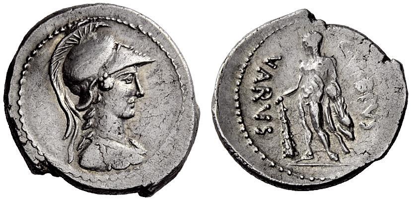 The Roman Republic. C. Vibius Varus. Denarius 42, AR 4.02g. Helmeted head of Minerva r., wearing aegis. Rev. C·VIBIVS–VARVS Hercules standing facing, holding club in r. hand and lion skin over l. arm. Babelon Vibia 26. Sydenham 1140. Sear Imperators 194. Crawford 494/38. Rare. Minor weakness on reverse, otherwise good extremely fine