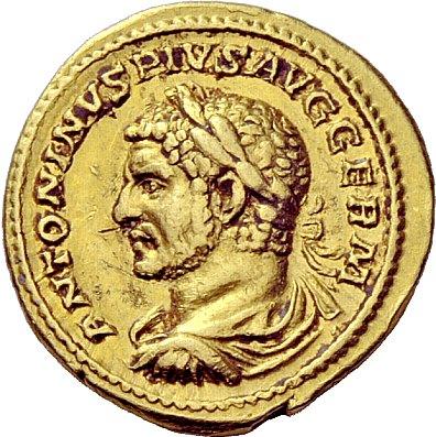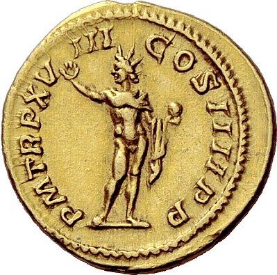 The Roman Republic. Caracalla augustus, 198–217. Aureus 215, AV 6.39g. Laureate, draped and cuirassed bust l. Rev. Sol, naked but for cloak over l. arm, standing facing, head l. raising r. arm and holding globe. C 285. BMC 134. RIC 264e. Calicó 2720 (these dies). Rare. Several marks in field and on edge, otherwise good very fine
