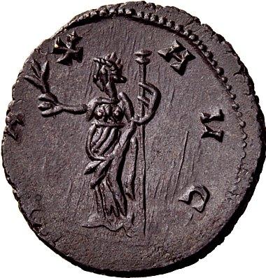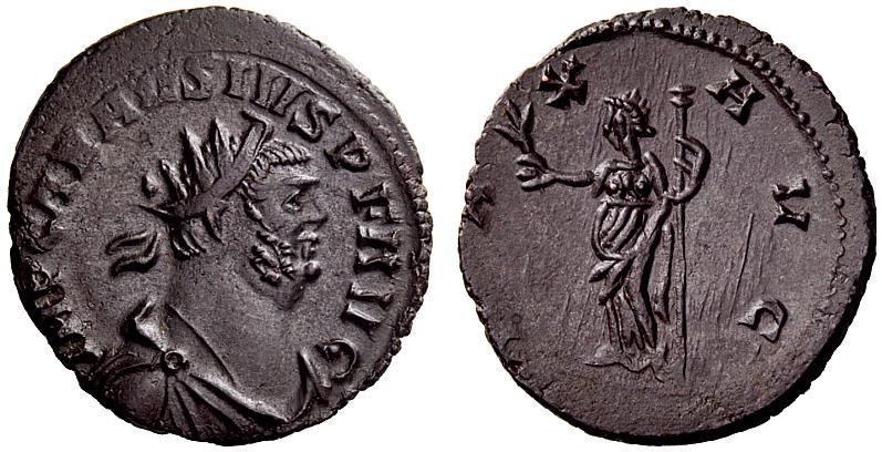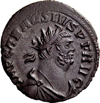 The Roman Republic. Carausius, 287–293. Antoninianus, uncertain mint 287-293, billon 4.49g. Radiate, draped and cuirassed bust r. Rev. Pax standing l., holding branch and sceptre. C 192. RIC 880. Extremely fine. Ex Gorny & Mosch sale 115, 2002, 1798.