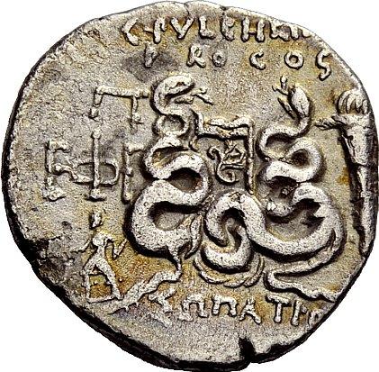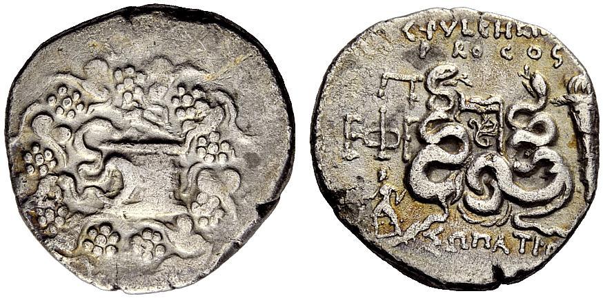 The Roman Republic, Cistophoric tetradrachm, Ephesus ca. 55-53, AR 11.46 g. Serpents emerging from cista mistica; all within wreath. Rev. C PVLCHER / PRO COS Two serpents standing by bow case; in l. field, monogram of Ephesus and in r. field, Nemesis. In exergue, SWPATROS. Stumpf 45. Extremely rare. Lightly toned and about very fine