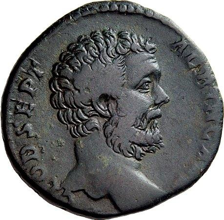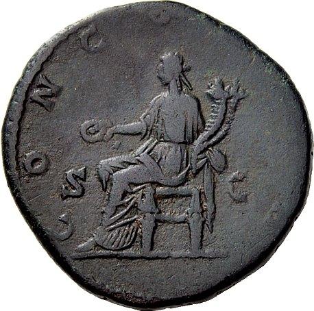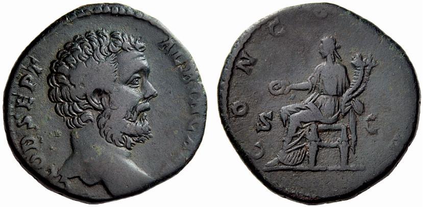 The Roman Republic. Clodius Albinus caesar, 193–195. Sestertius 194-195, Æ 17.68 g Bare head r. Rev. Concordia seated l., holding patera and cornucopiae. C 7 var. BMC S. Severus 121. RIC 62. Green patina, very fine