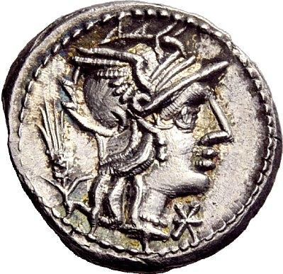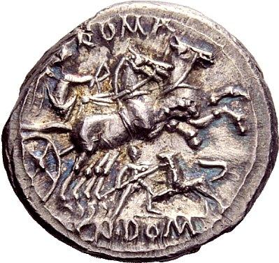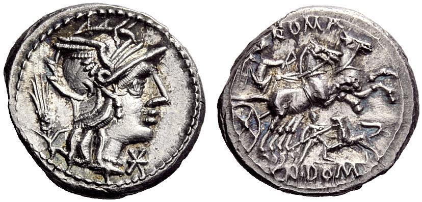 The Roman Republic. Cn. Domitius Ahenobarbus. Denarius 128, AR 3.97g. Helmeted head of Roma r.; below chin, Û. Behind, stalk of corn. Rev. Victory in biga r., holding reins in l. hand and whip in r.; above, ROMA. Below horses, man fighting lion; in exergue, CN·DOM. Babelon Domitia 14. Sydenham 514. Crawford 261/1. Lightly toned and extremely fine. Ex NAC sale 15, 1999, 73.